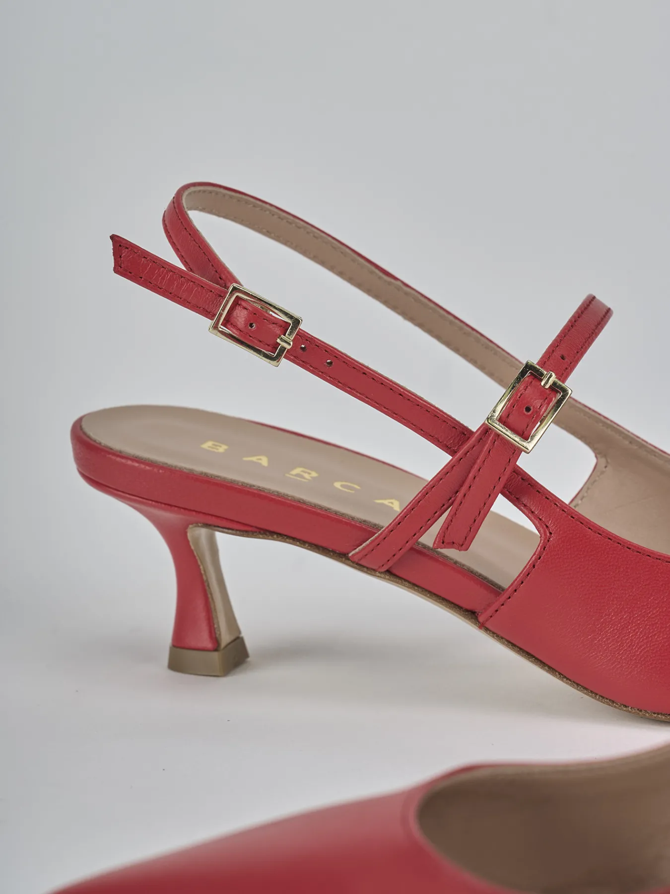Slingback decolte’ tacco 5 cm fondo in cuoio e soletto interno in vera pelle. Tomaia in morbida pelle, punta sfilata, scollo a ‘U’, cinturino con fibbia sul collo del piede e cinturino sul tallone con fibbia regolabile e tacco rocchetto per un look cool.