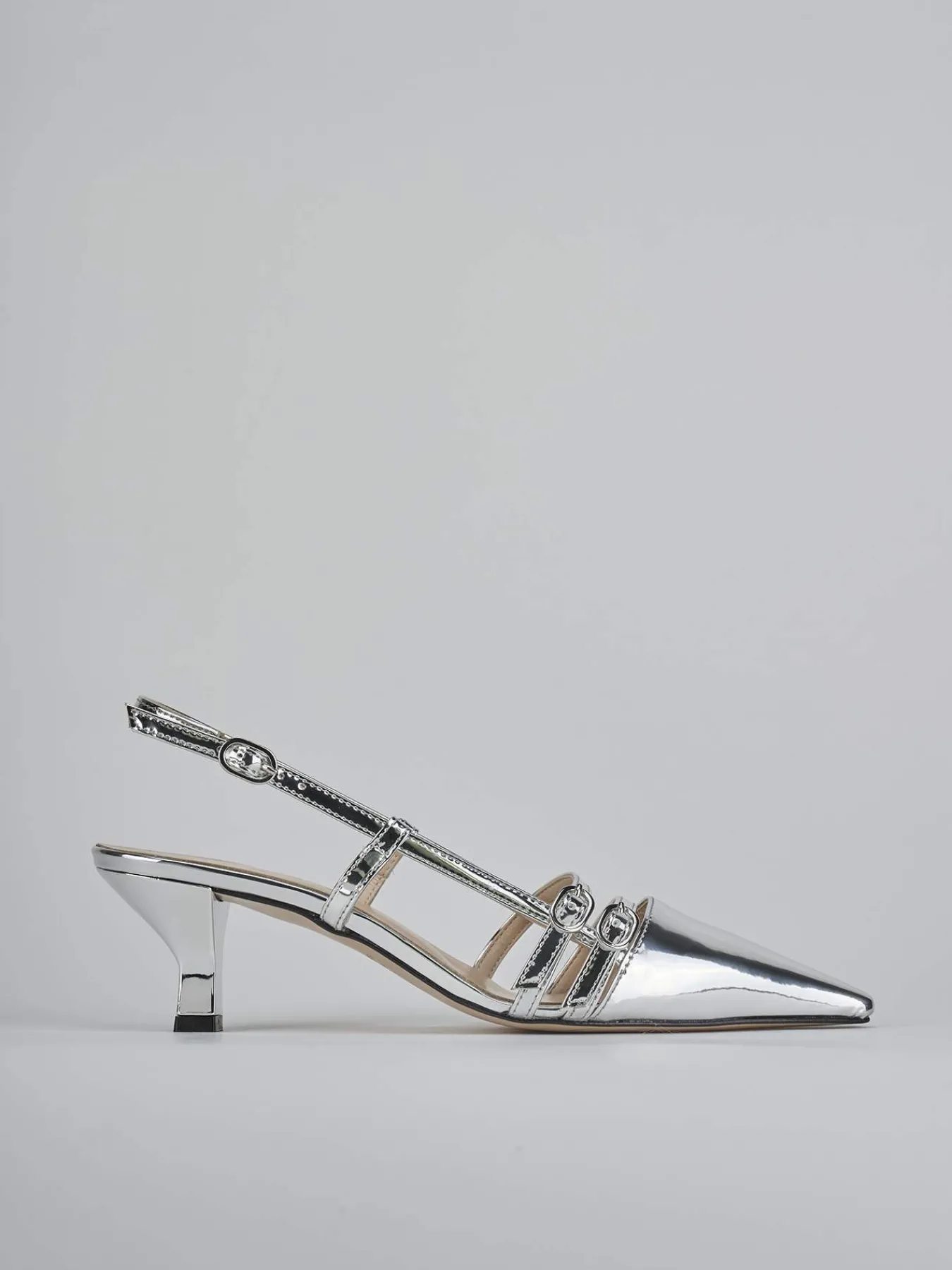 Slingback decolte’ tacco 6 cm fondo in cuoio e soletto interno in vera pelle. Tomaia in morbida pelle laminata a specchio, punta sfilata, puntale, due cinturini con fibbia regolabile sul collo del piede e cinturino sul tallone e comodo tacco geometrico. Perfetto sia con dei jeans sia con un vestito.