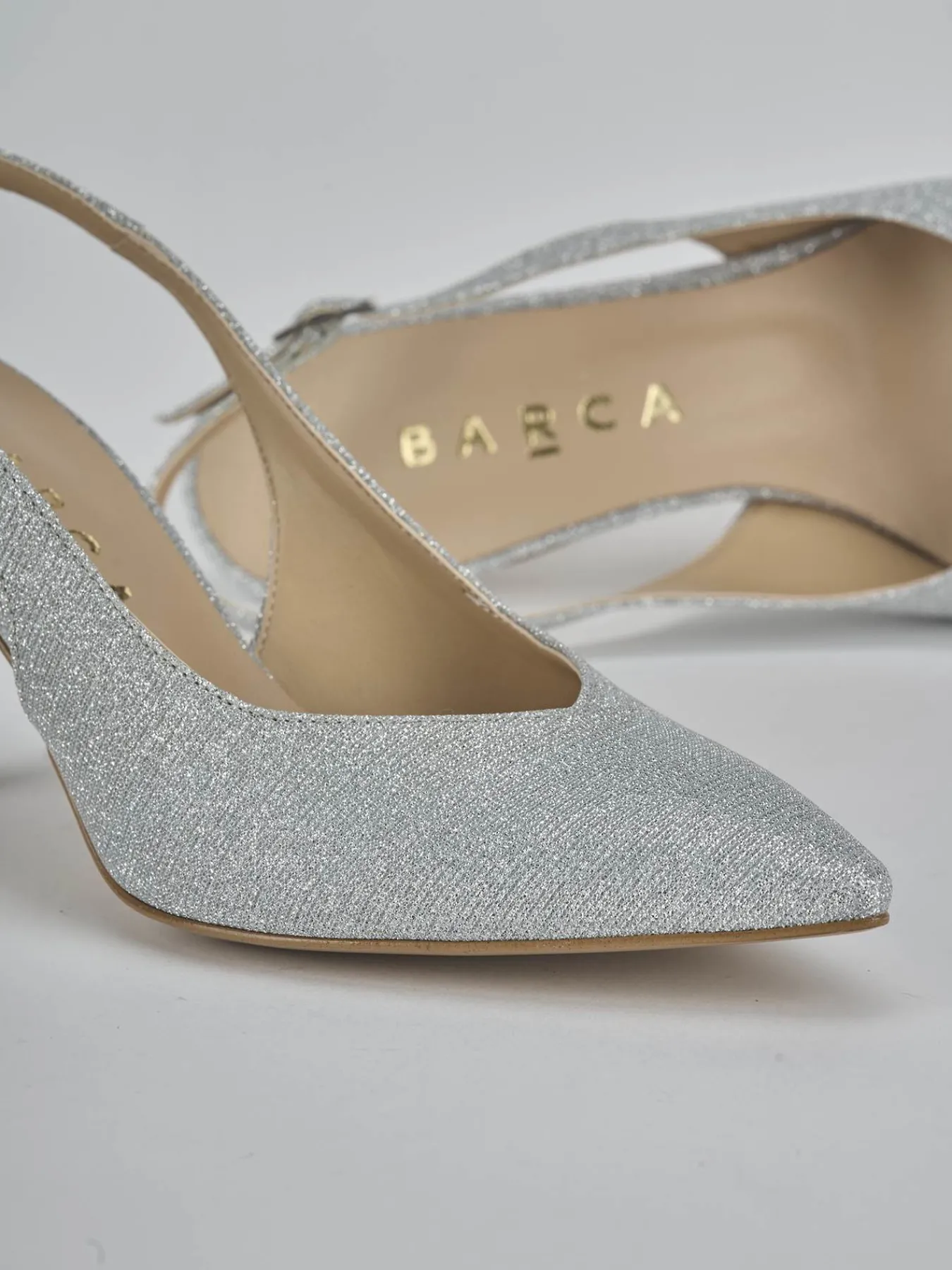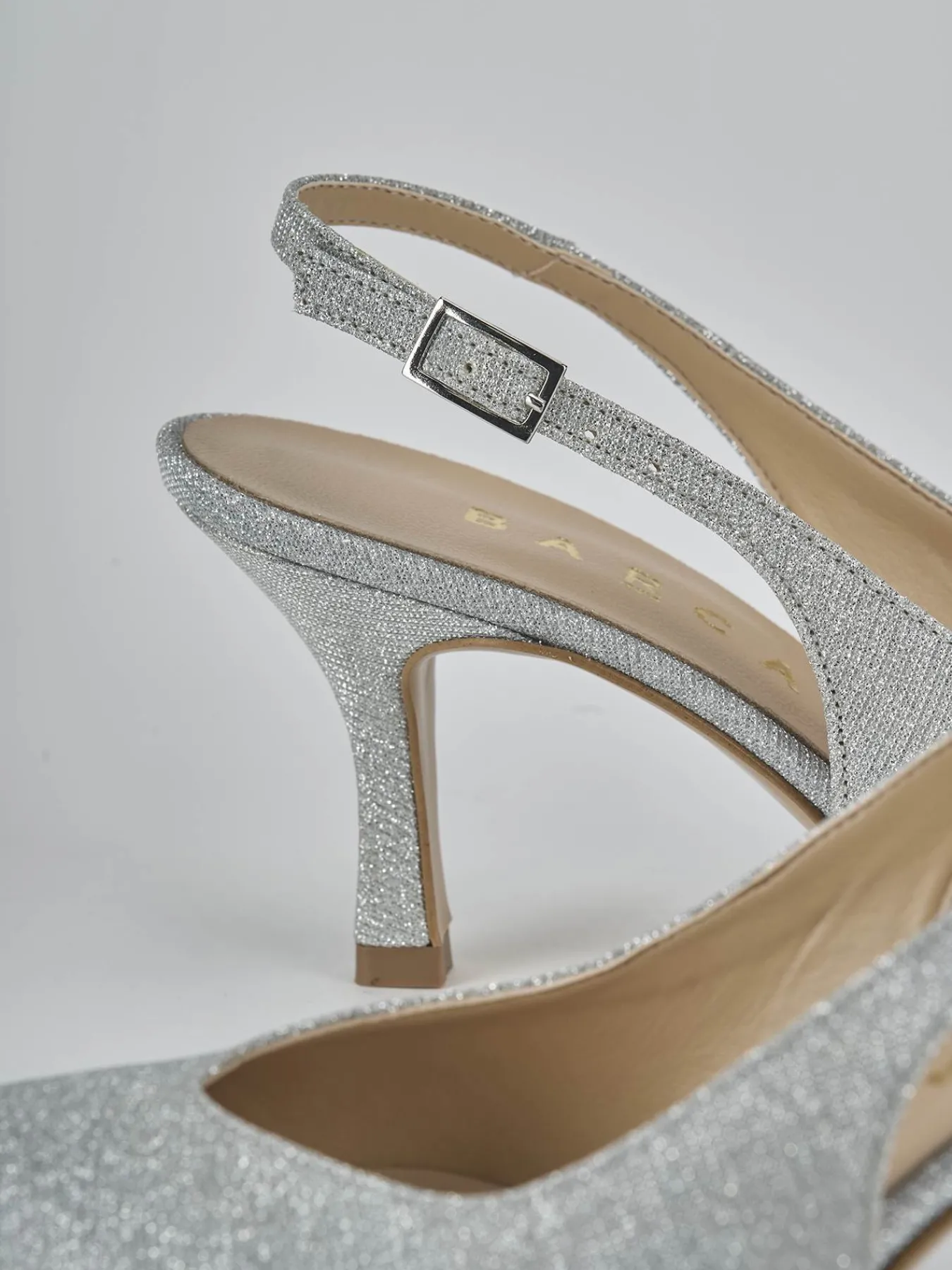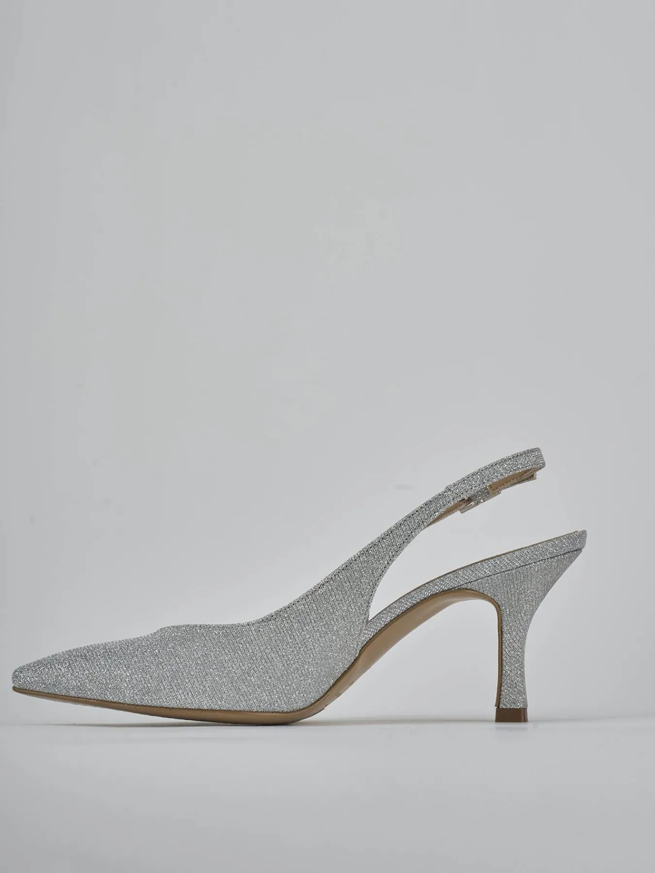 Slingback decolte’ tacco 7 cm fondo in leggerissima gomma e soletto interno in vera pelle. Tomaia in morbida pelle ricoperta in glitter, punta sfilata, scollo a ‘V’, cinturino con fibbia regolabile e tacco rocchetto. Perfetto per le tue occasioni più speciali.
