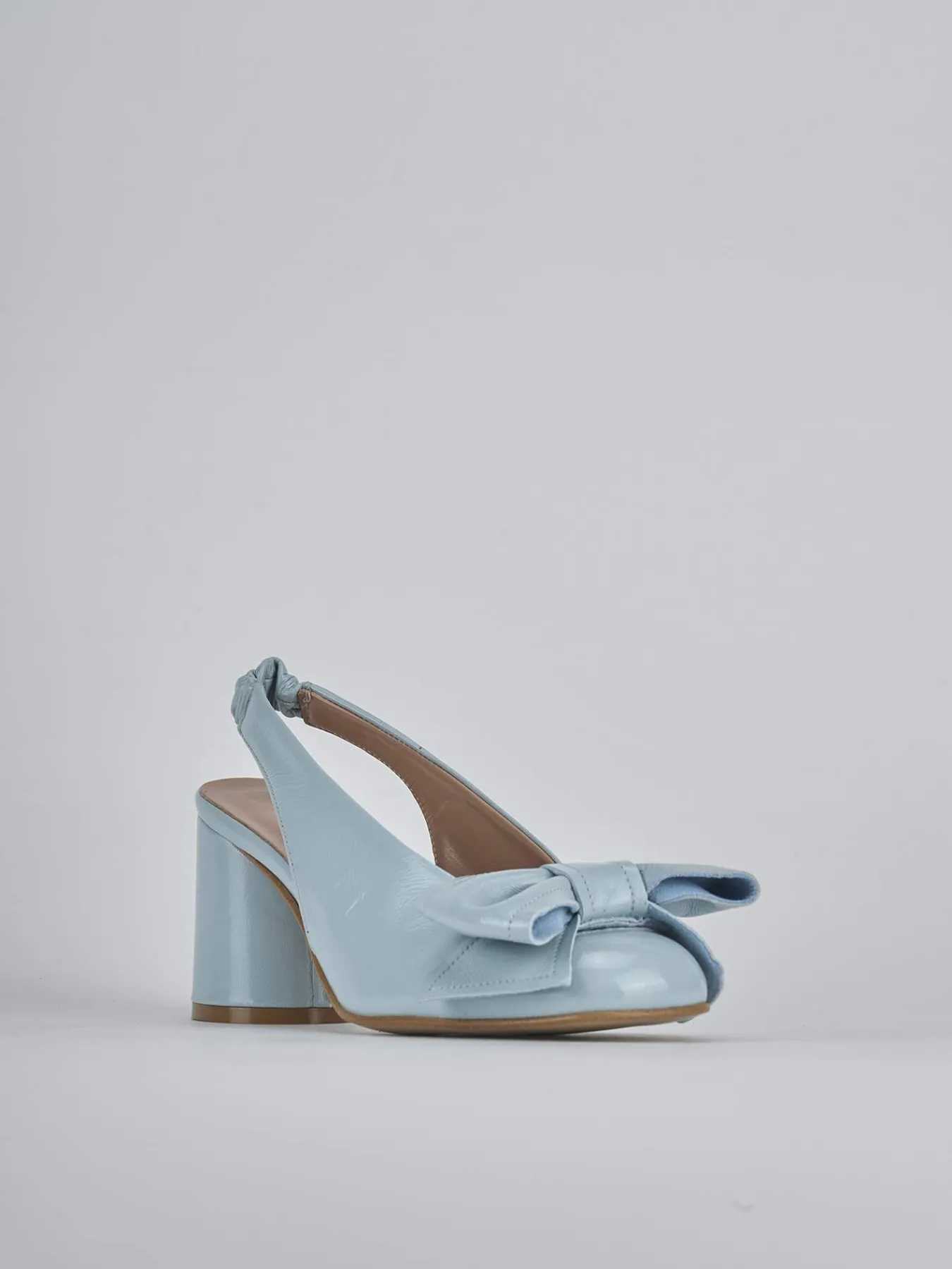 Slingback decolte’ tacco 8 cm fondo in leggerissima gomma e soletto interno in vera pelle. Tomaia in morbida pelle, punta affusolata, scollo a ‘U’, fiocco, cinturino elasticizzato morbido e tacco cilindrico. Dal design curato, che ti farà notare.