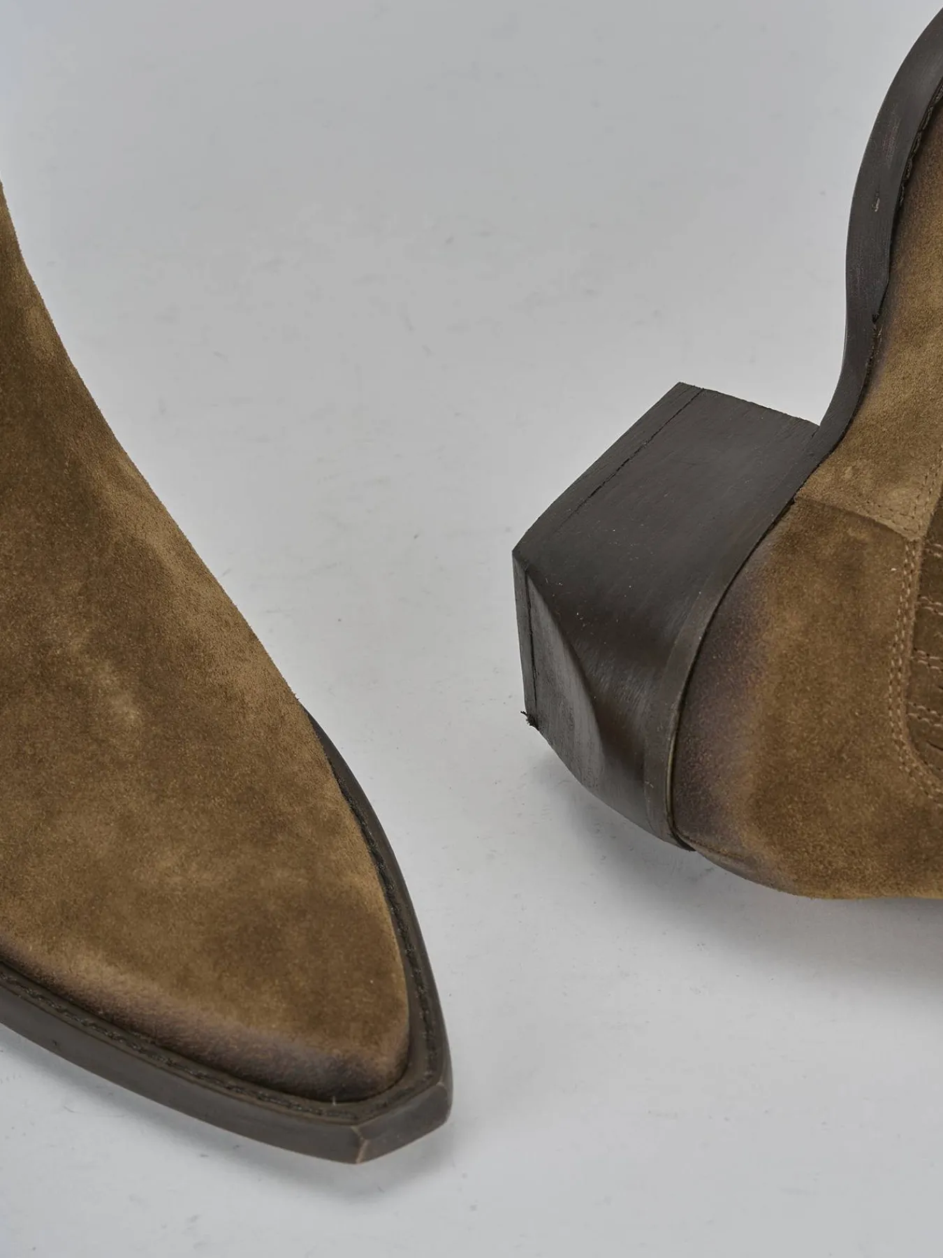 La tomaia in morbida pelle scamosciata e la punta sfilata conferiscono un aspetto sofisticato, mentre il guardolo sporgente aggiunge un dettaglio distintivo.