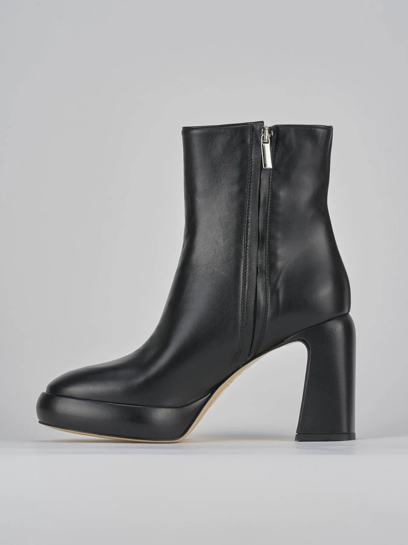 Stivaletto tacco 9 cm fondo in cuoio e soletto interno in vera pelle. Tomaia in morbida pelle, punta leggermente squadrata, comoda cerniera laterale, plateau bombato di 2 cm e tacco grosso per un look sporty-chic.