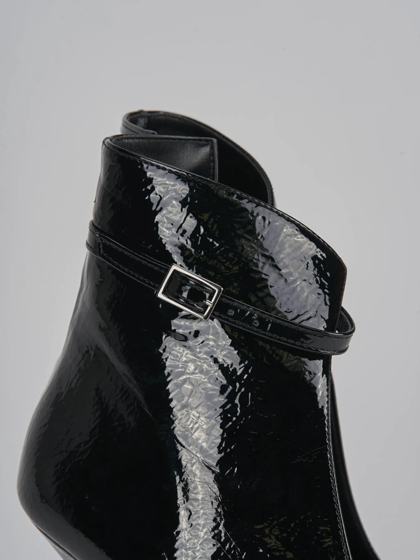 stivaletto tacco 9 cm fondo in leggera gomma e soletto interno in vera pelle. tomaia in morbida pelle effetto verniciato, punta sfilata, aperto lateralmente fino alla punta e leggermente oltre la caviglia con cinturino con fibbia regolabile. comodo tacco rocchetto per un look edgy.