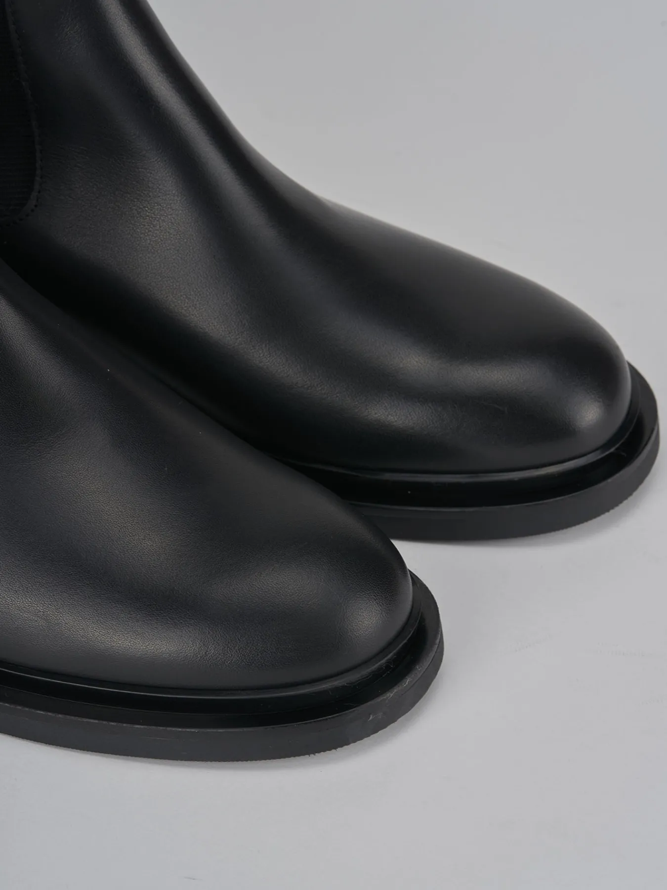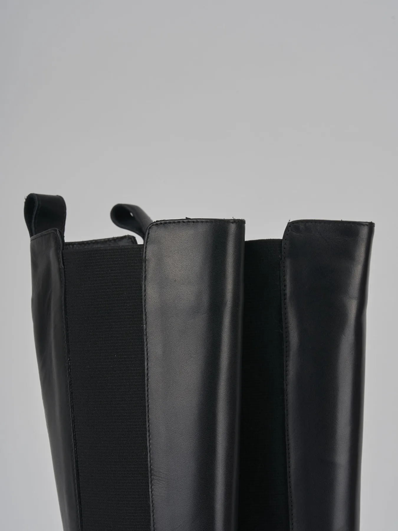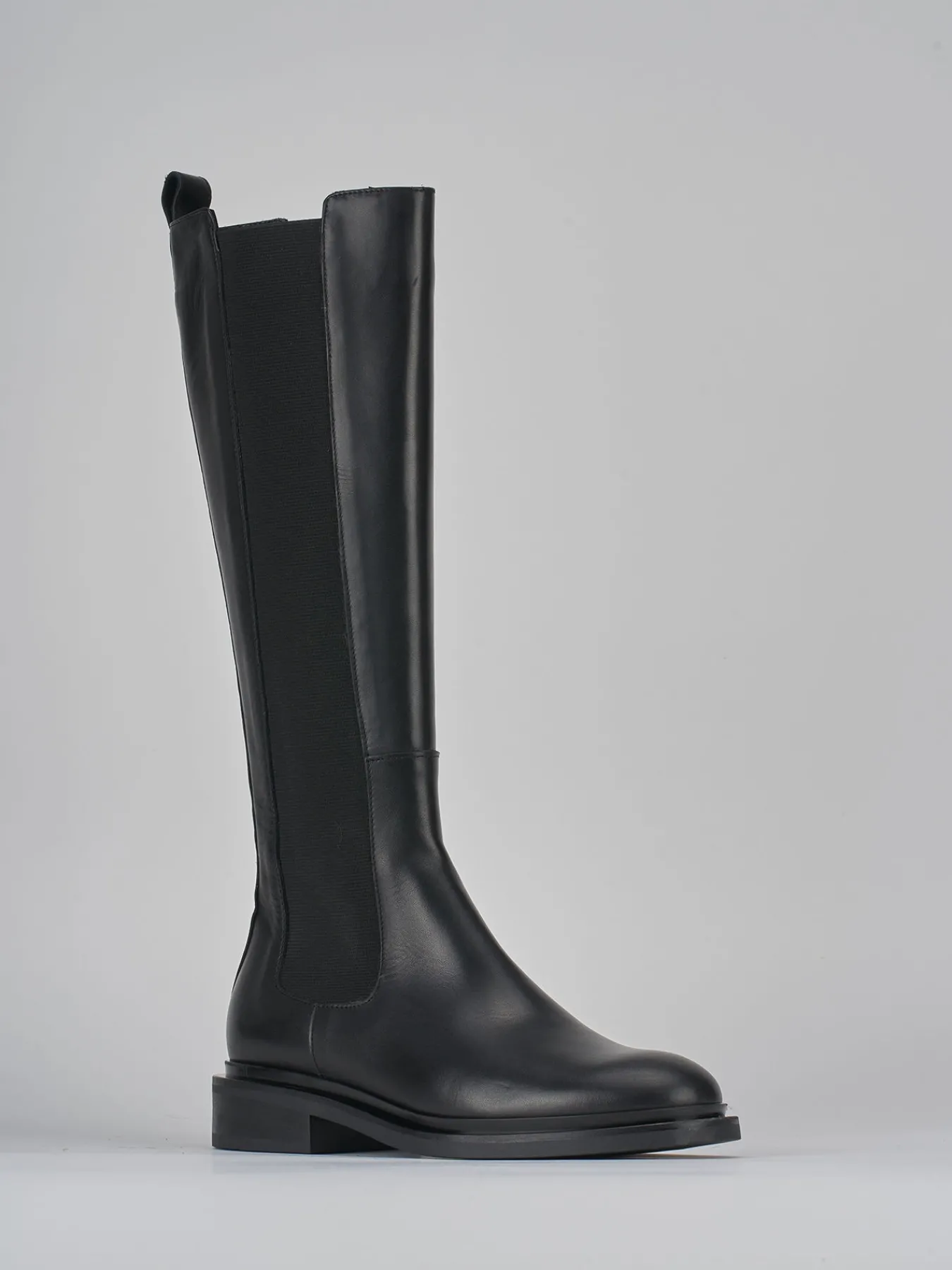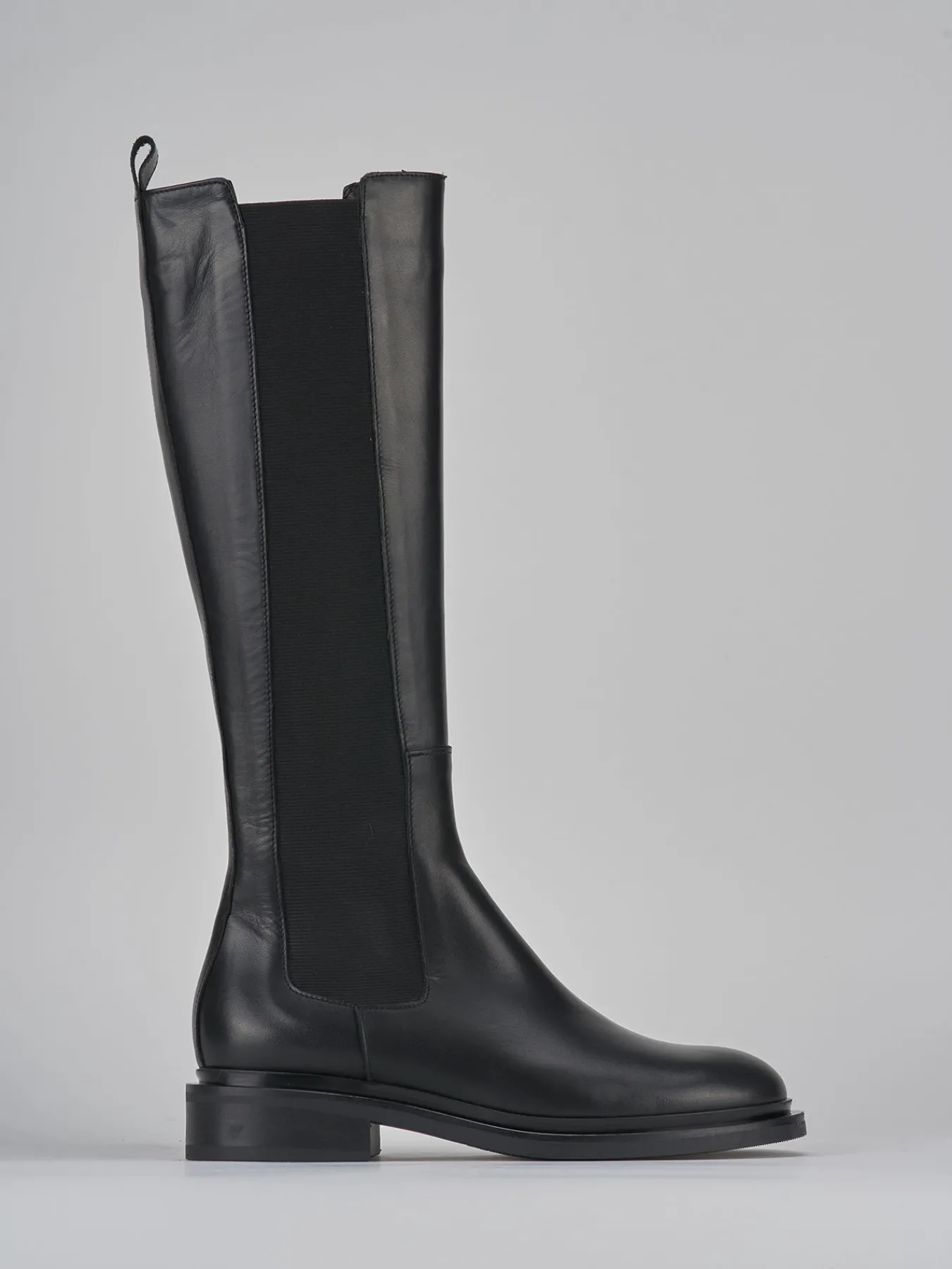 Stivale tacco 2 cm fondo in gomma e soletto interno in vera pelle. Tomaia in morbida pelle, punta tonda, cuciture a vista lungo il gambale che misura appena sotto il ginocchio con tessuto elasticizzato ai lati. dal design sottile ed elegante, è il modello passepartout per eccellenza.