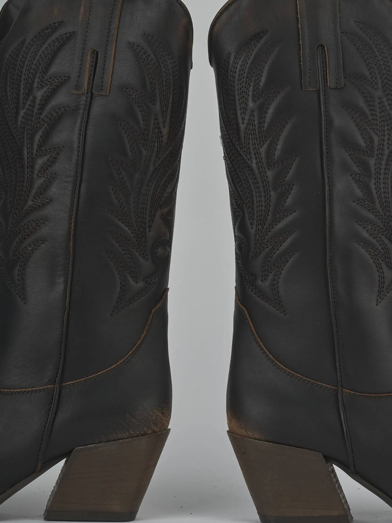 Realizzati in morbida pelle Texas, presentano una tomaia con cuciture a mano in rilievo e ricami in tinta che decorano la punta e il gambale.