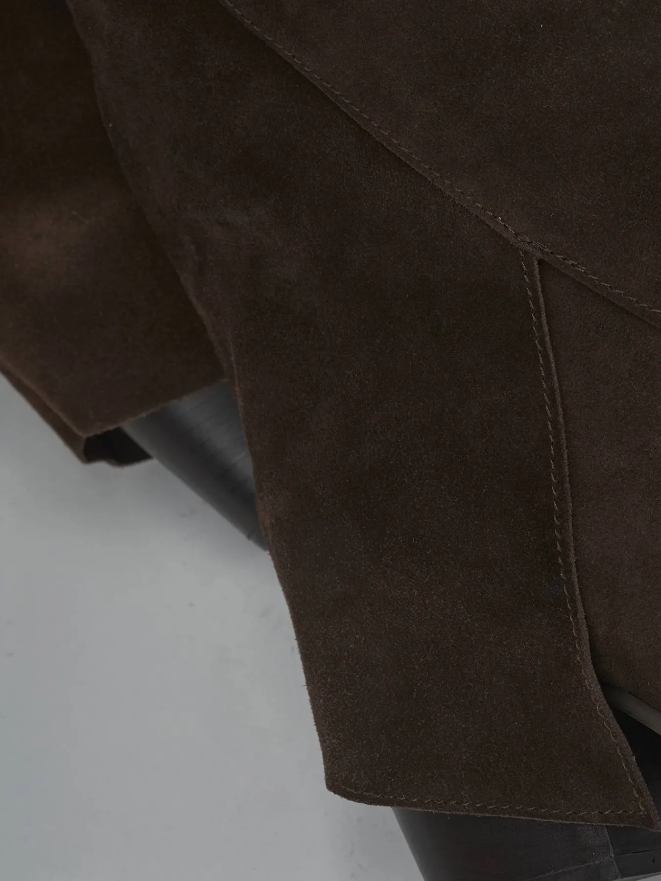 La tomaia in morbido camoscio avvolge la gamba fino appena sotto il ginocchio, mentre la punta sfilata aggiunge un dettaglio sofisticato.