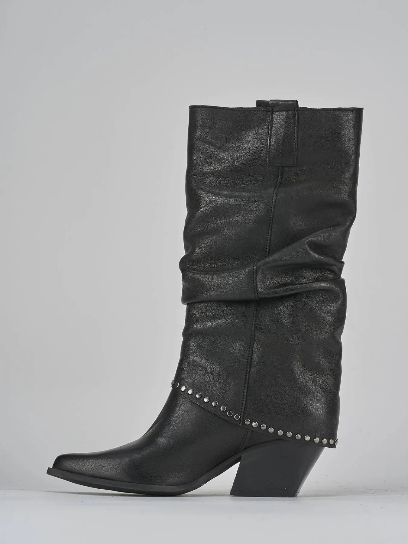 La punta sfilata e il risvolto aggiungono un tocco di raffinatezza, mentre le borchie e il guardolo sporgente donano un look cool e moderno.