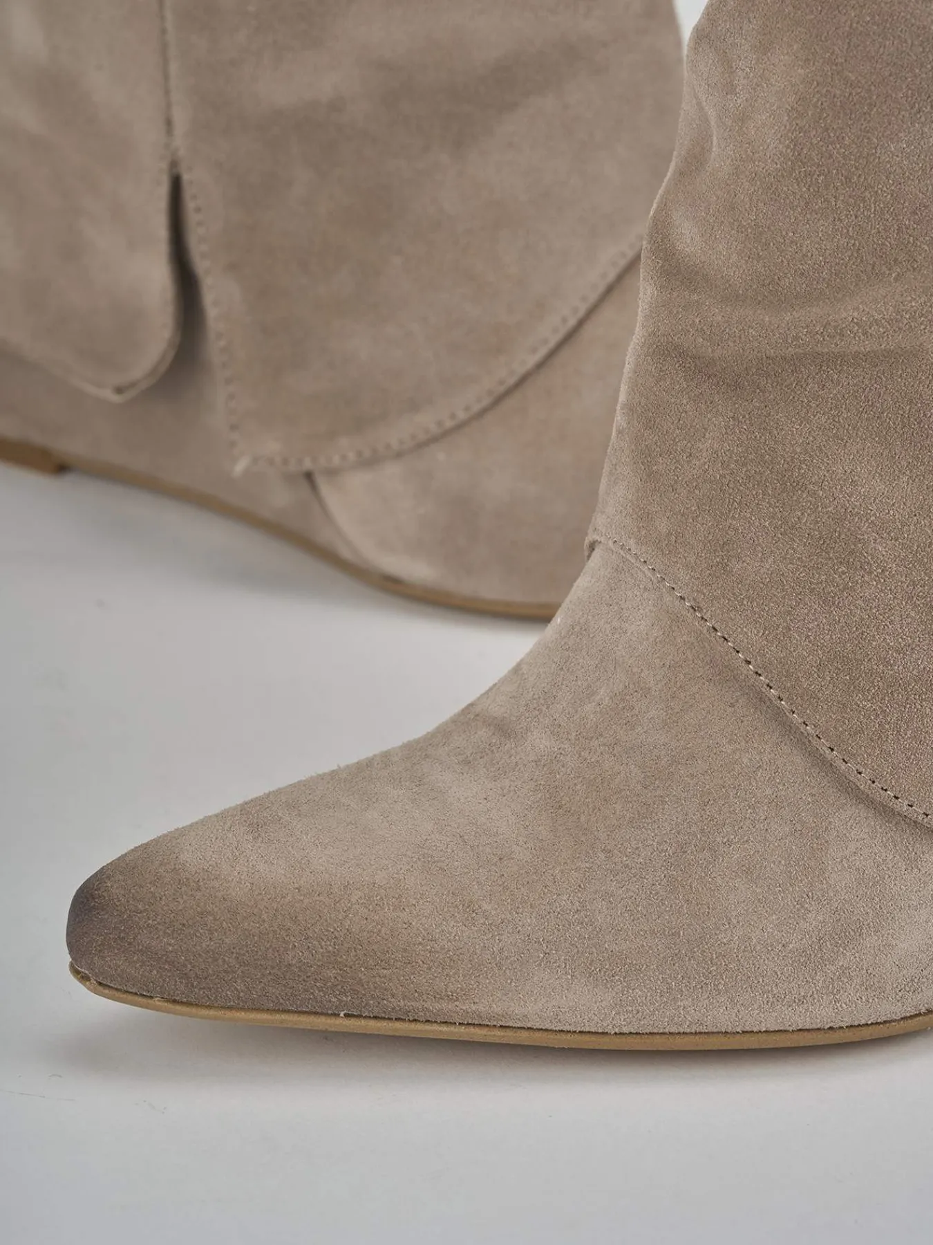 Stivale zeppa 9 cm fondo in leggera gomma e soletto interno in vera pelle. Tomaia in morbido camoscio, punta sfilata, risvolto con piccolo spacco sul gambale che misura a 3/4 del polpaccio, cinturino con accessorio in metallo e zeppa stabile. Perfetto con una gonna e una camicia.