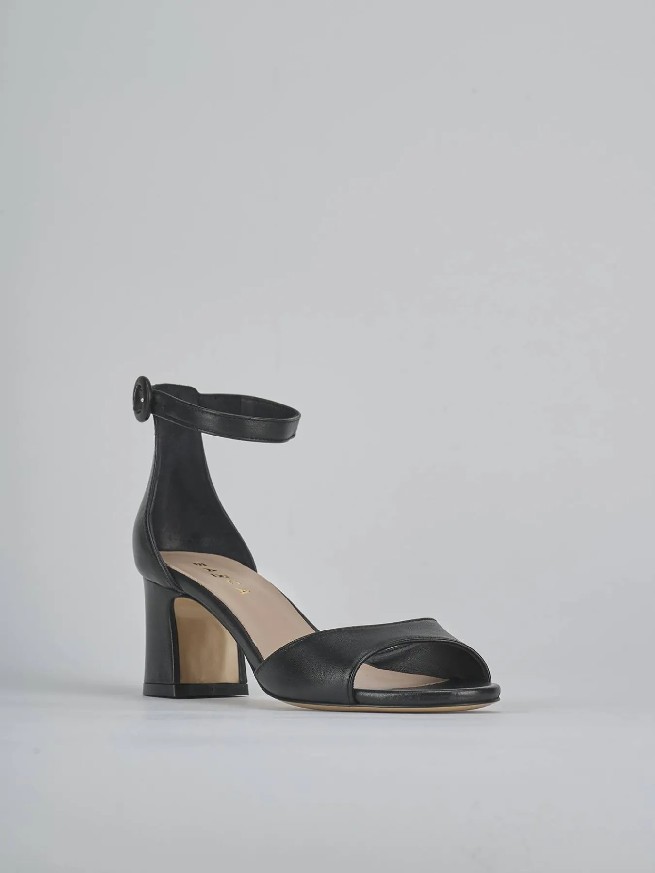 Sandalo tacco 5 cm fondo in cuoio e soletto interno in vera pelle. Tomaia in morbida pelle, punta affusolata, fascia unica in punta con taglio a mezza luna, cintuirno con fibbia regolabile in tinta e tacco grosso. Dal design che dura nel tempo.