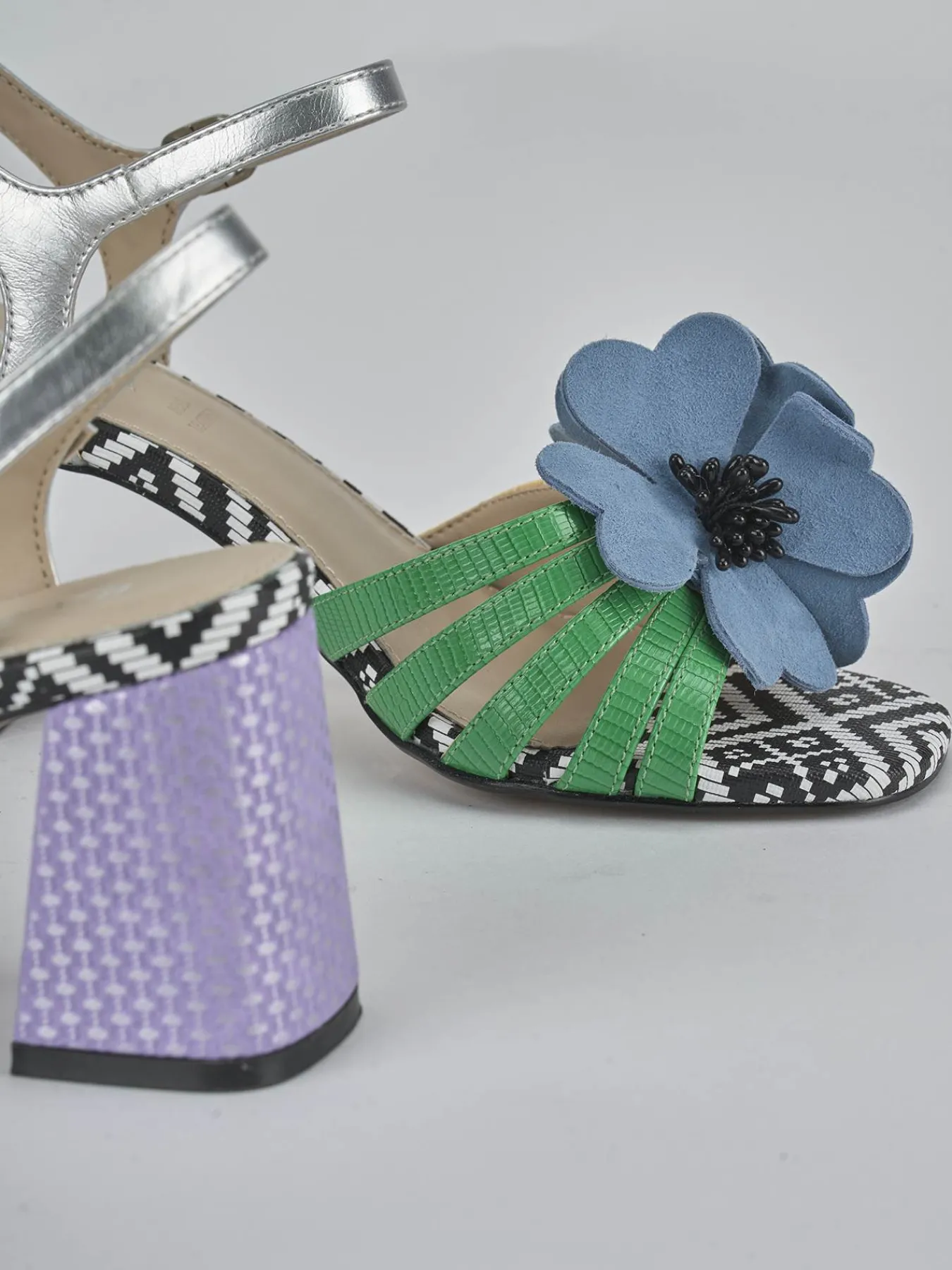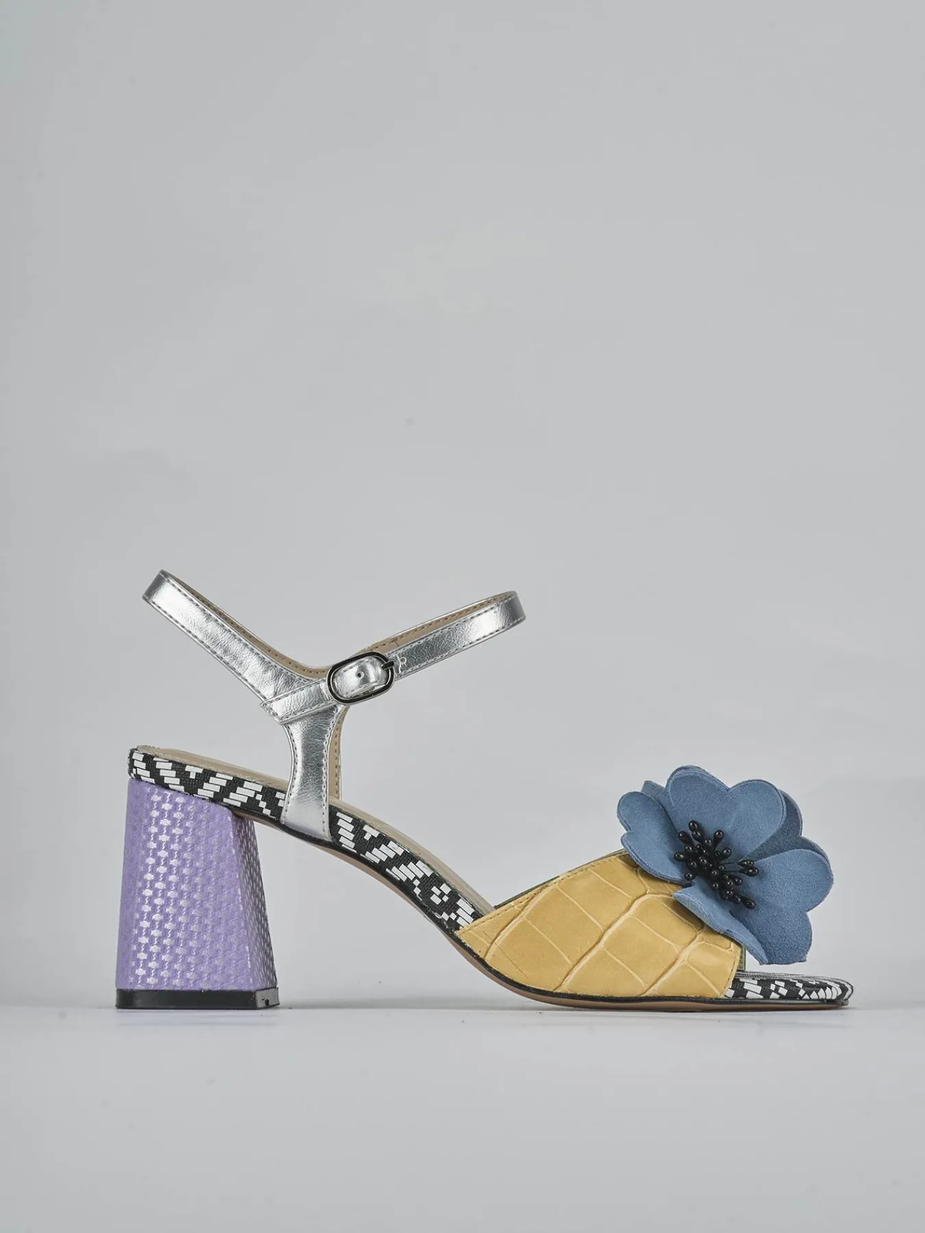 Sandalo tacco 7 cm fondo in gomma e soletto interno in vera pelle. Tomaia in morbida pelle, punta leggermente squadrata, fascia, accessorio floreale, cinturino in caviglia con fibbia regolabile e tacco grosso stabile. Perfetto con una gonna e t-shirt.