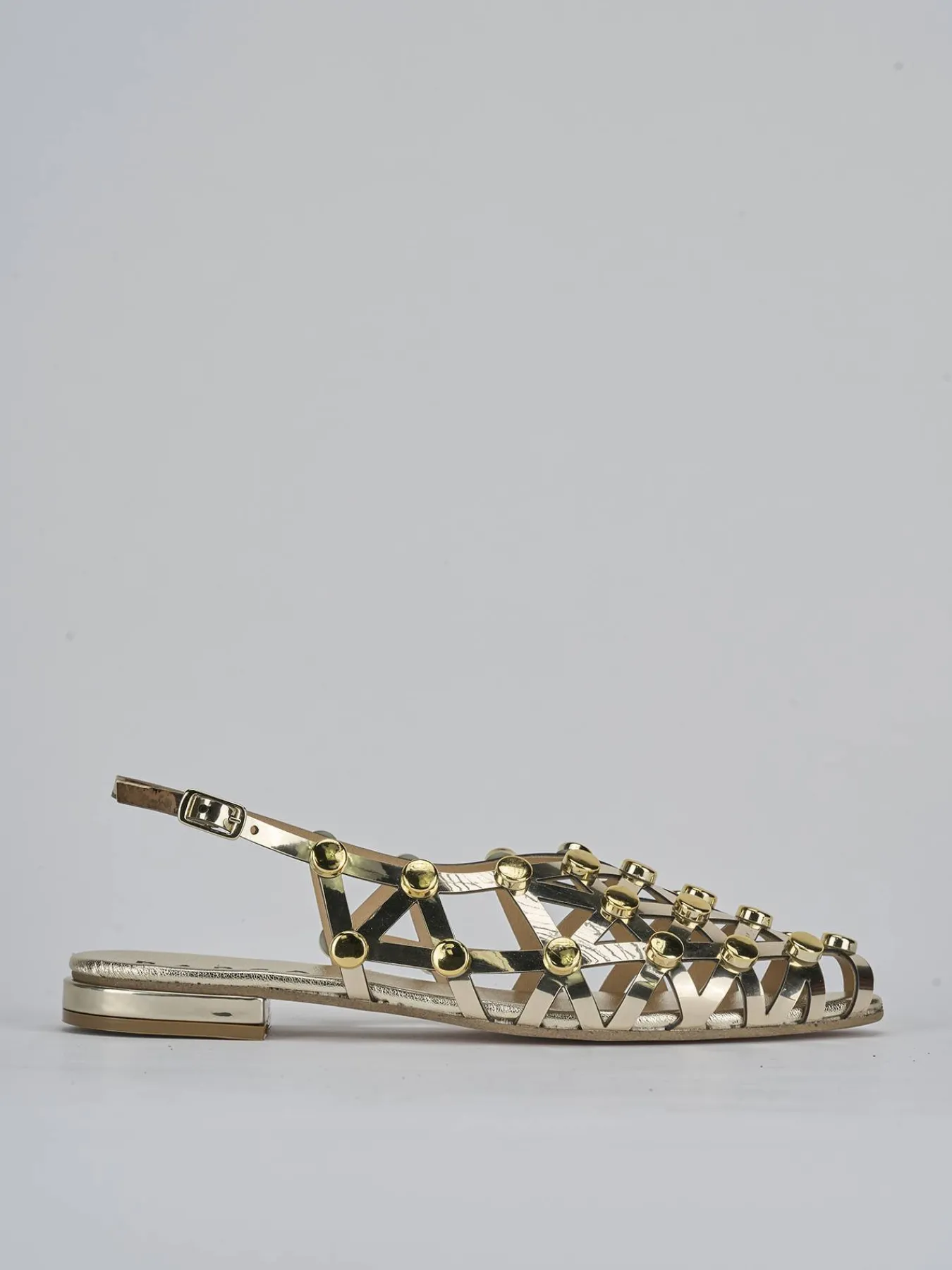 Sandalo tacco 2 cm, fondo in cuoio e soletto interno in vera pelle. Tomaia in morbida pelle effetto specchio, punta sfilata, ragnetto con borchie e cinturino con fibbia regolabile in caviglia. Per un look davvero cool.
