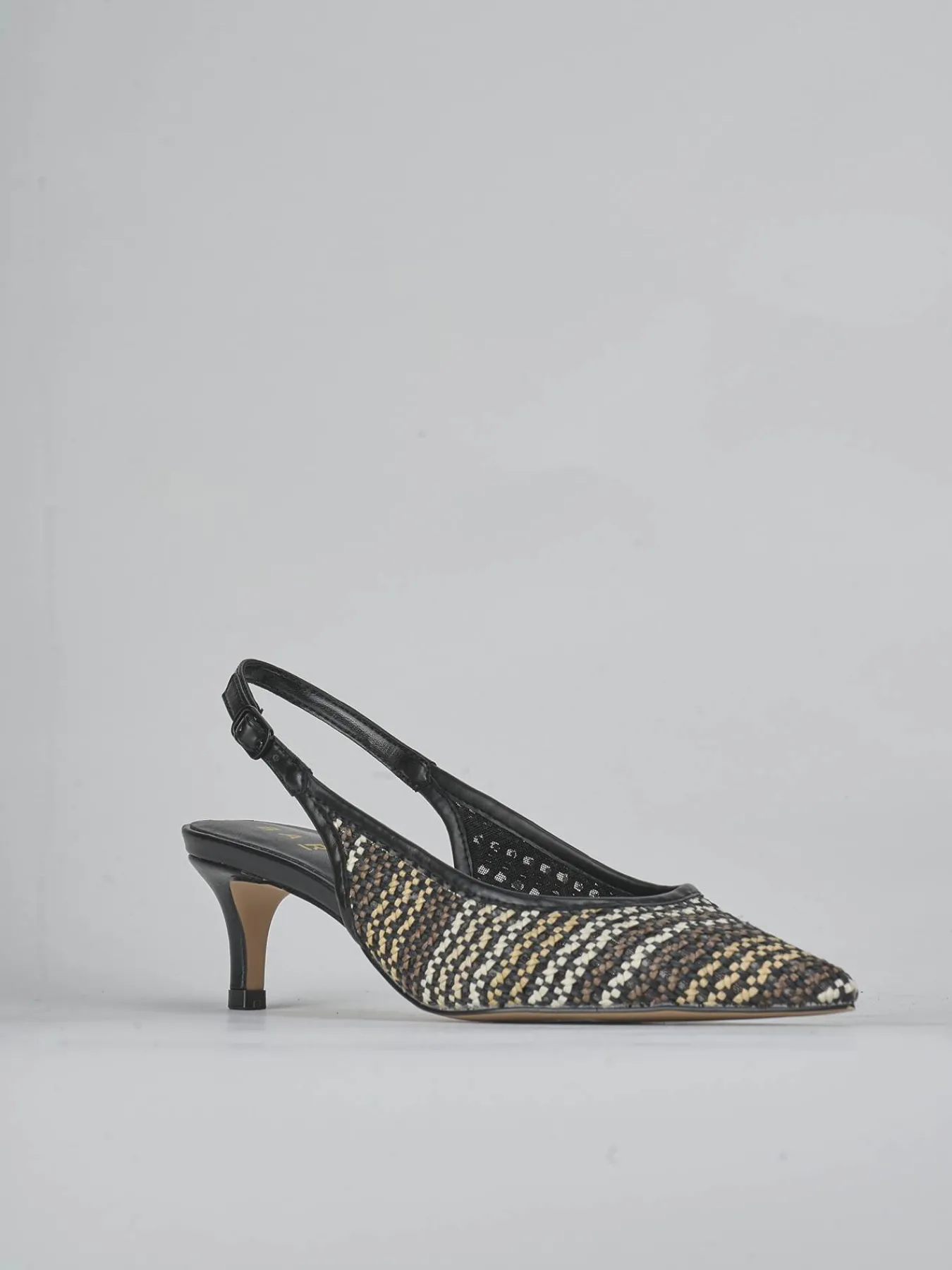 Slingback tacco 5 cm fondo in leggera gomma e soletto interno in vera pelle. Tomaia in morbida pelle finemente intrecciata ricoperta in tessuto grezzo rafia, punta sfilata, scollo profondo a ‘U’, bordo spesso, cinturino con fibbia regolabile e tacco fino. Un must da avere nell’armadio.