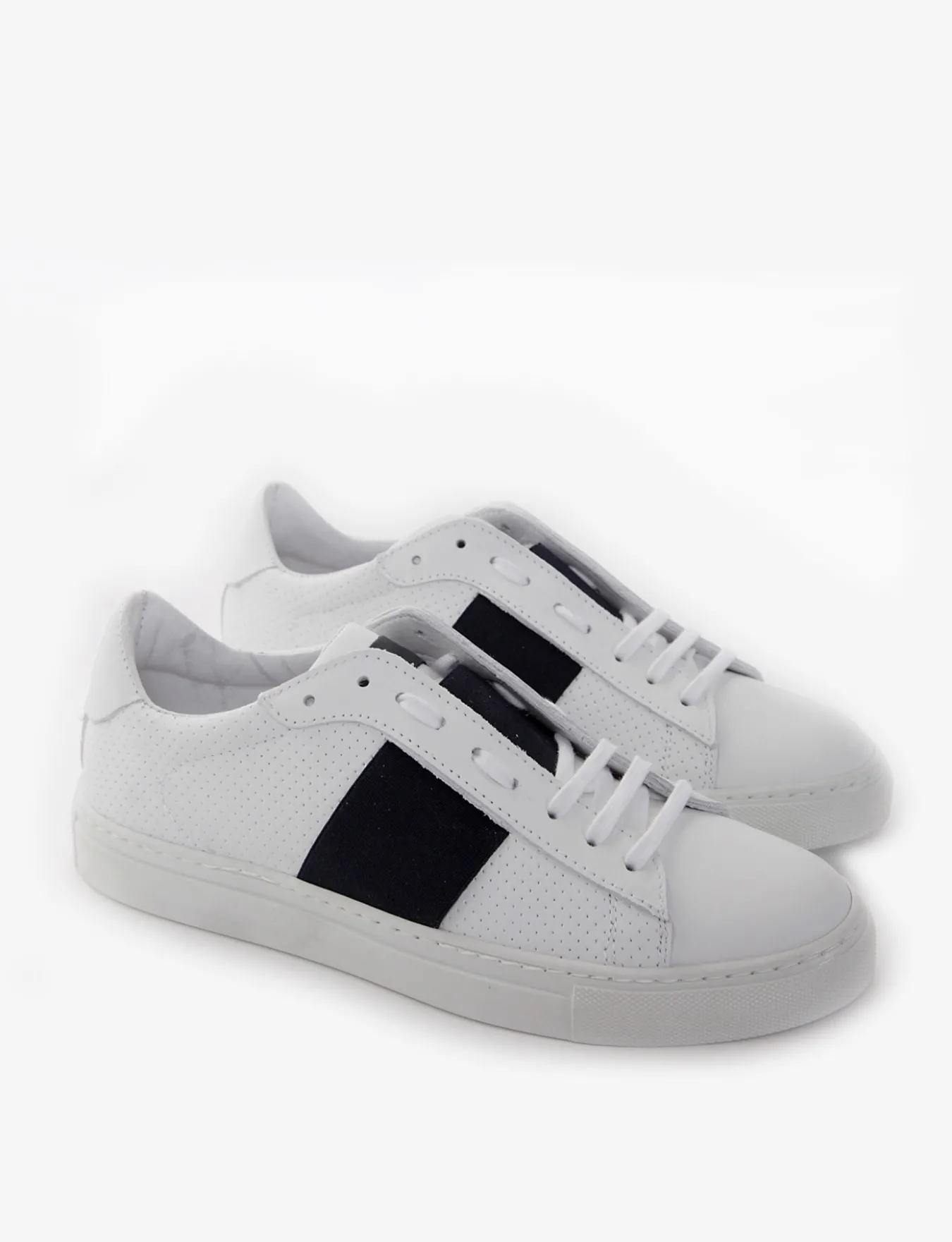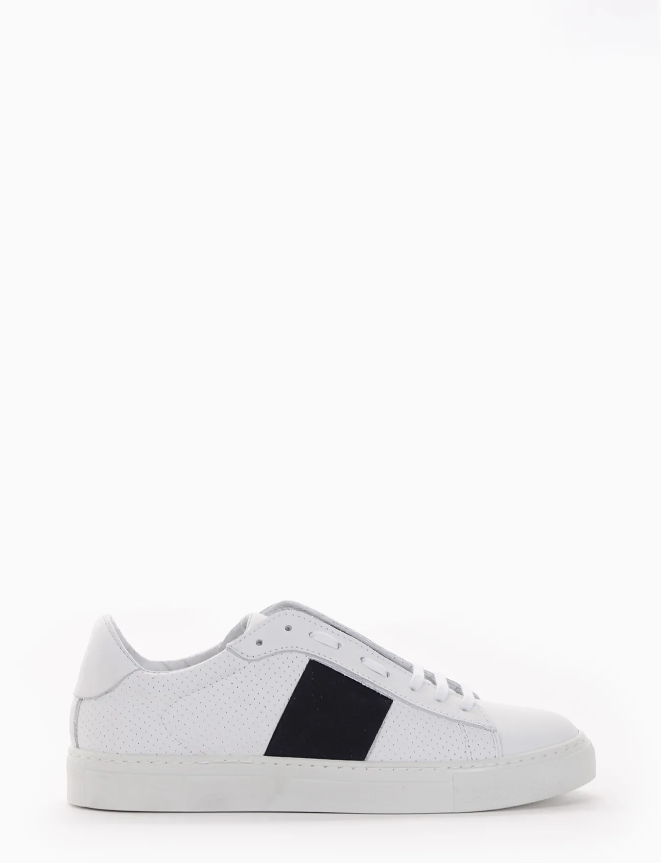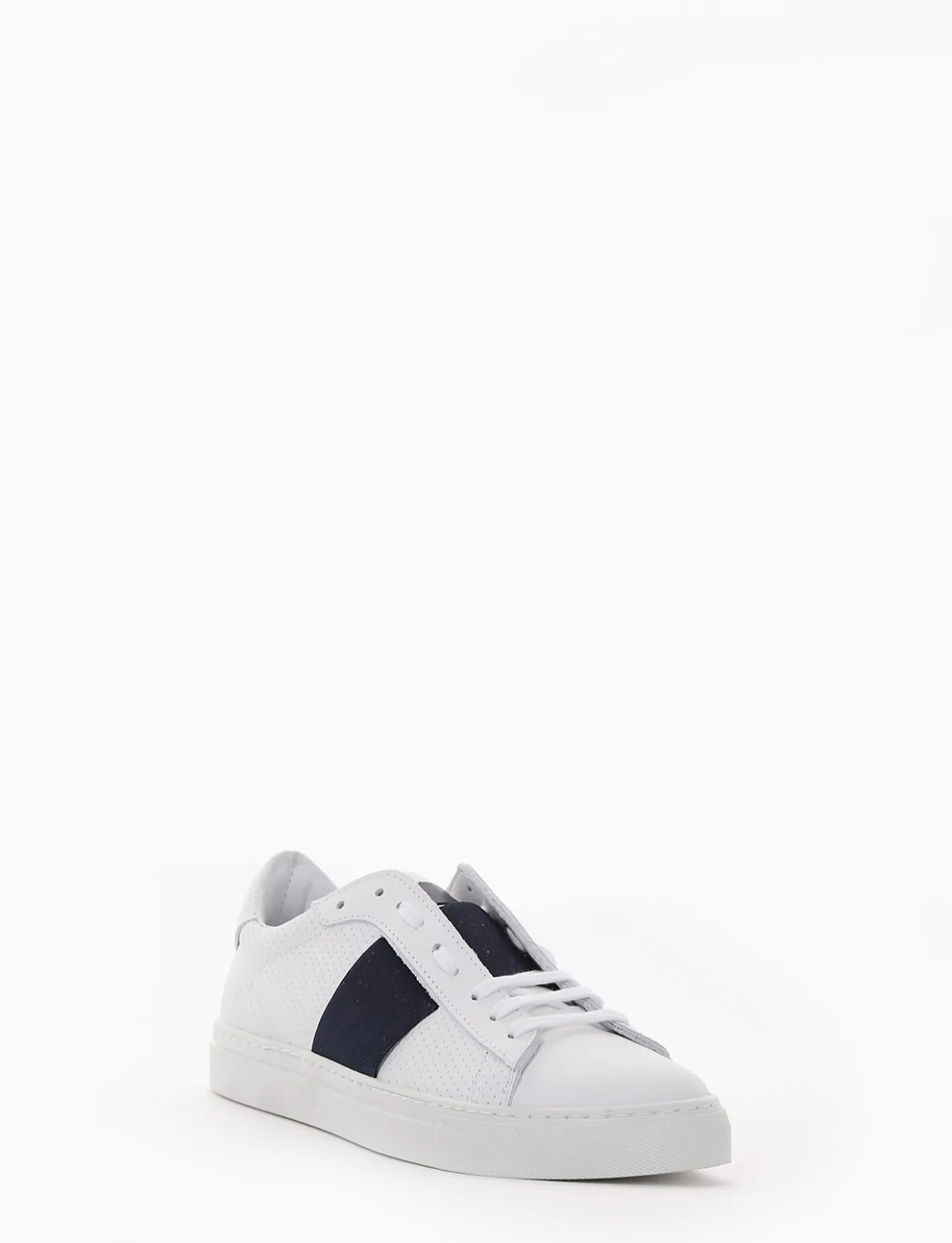 sneakers fondo in gomma e soletto interno in vera pelle. Tomaia in morbidissima pelle nappata, puntale liscio e microforatura laterale con applicazione di una fascia elastica color blu, ideale per il tuo tempo libero.