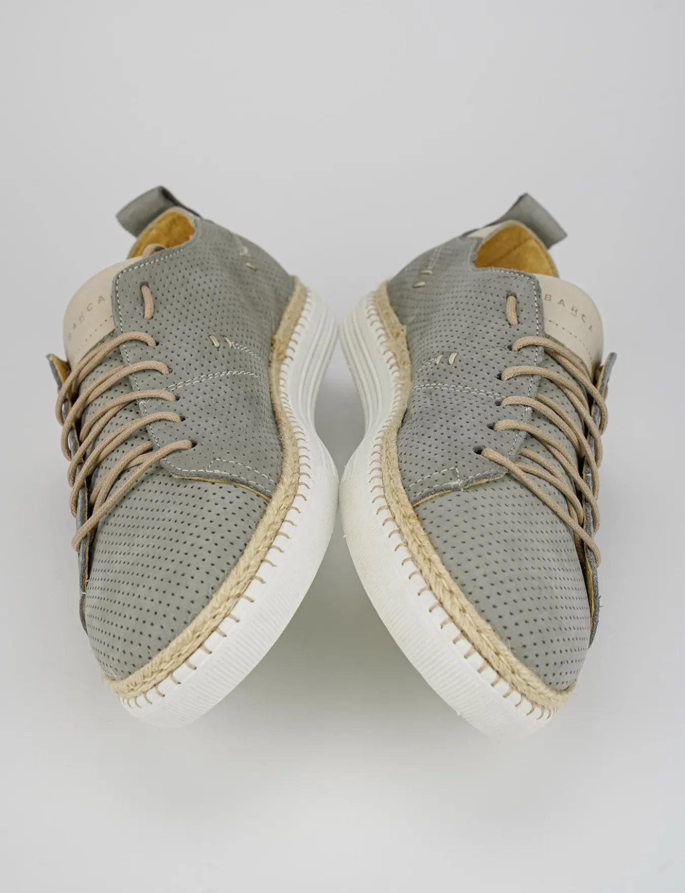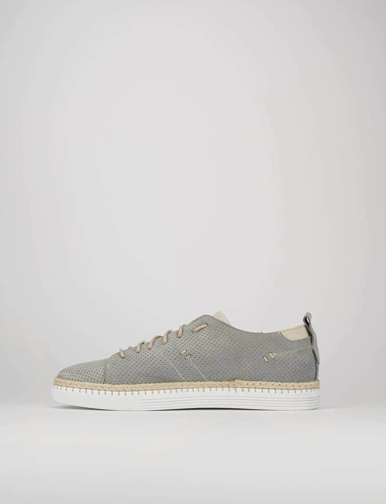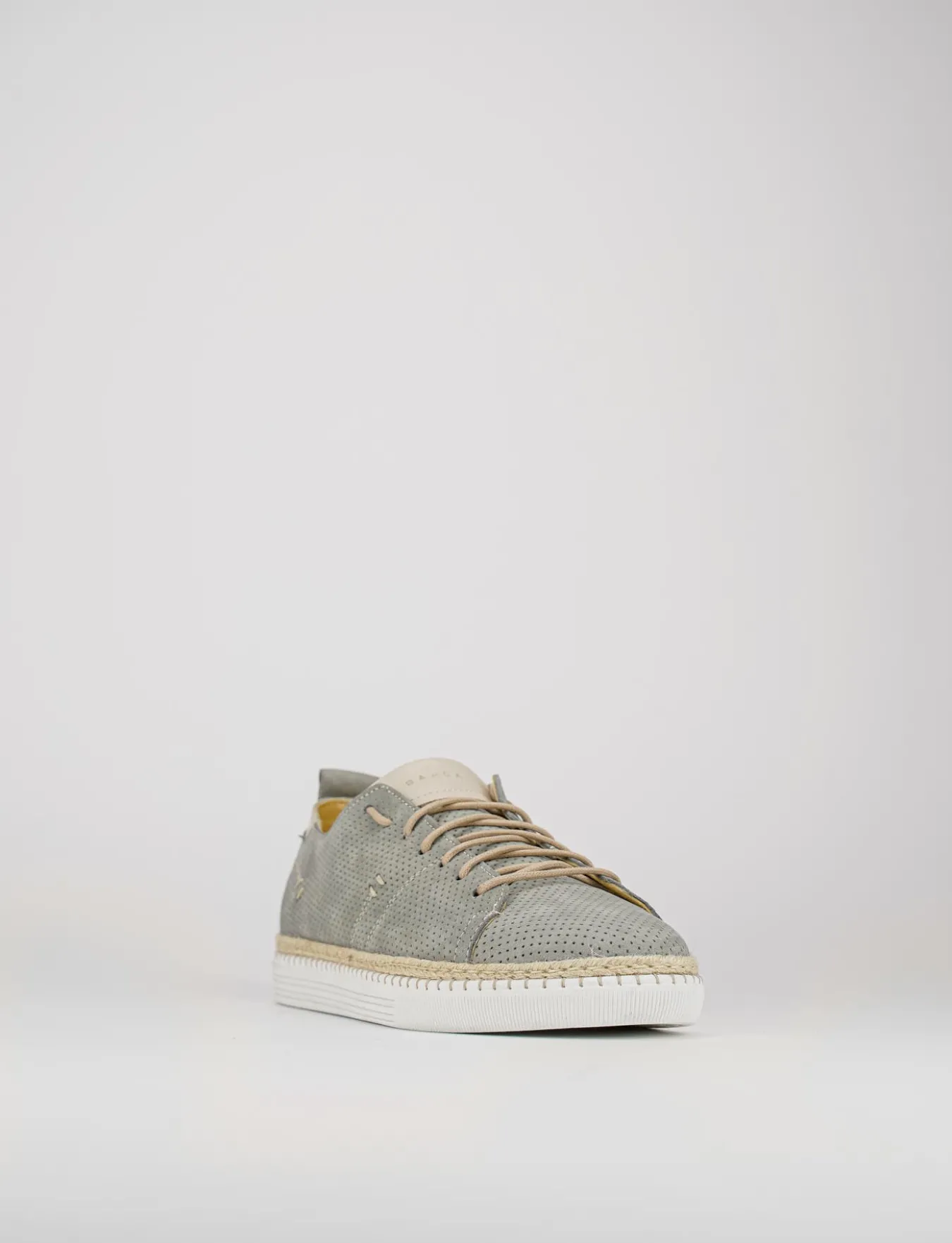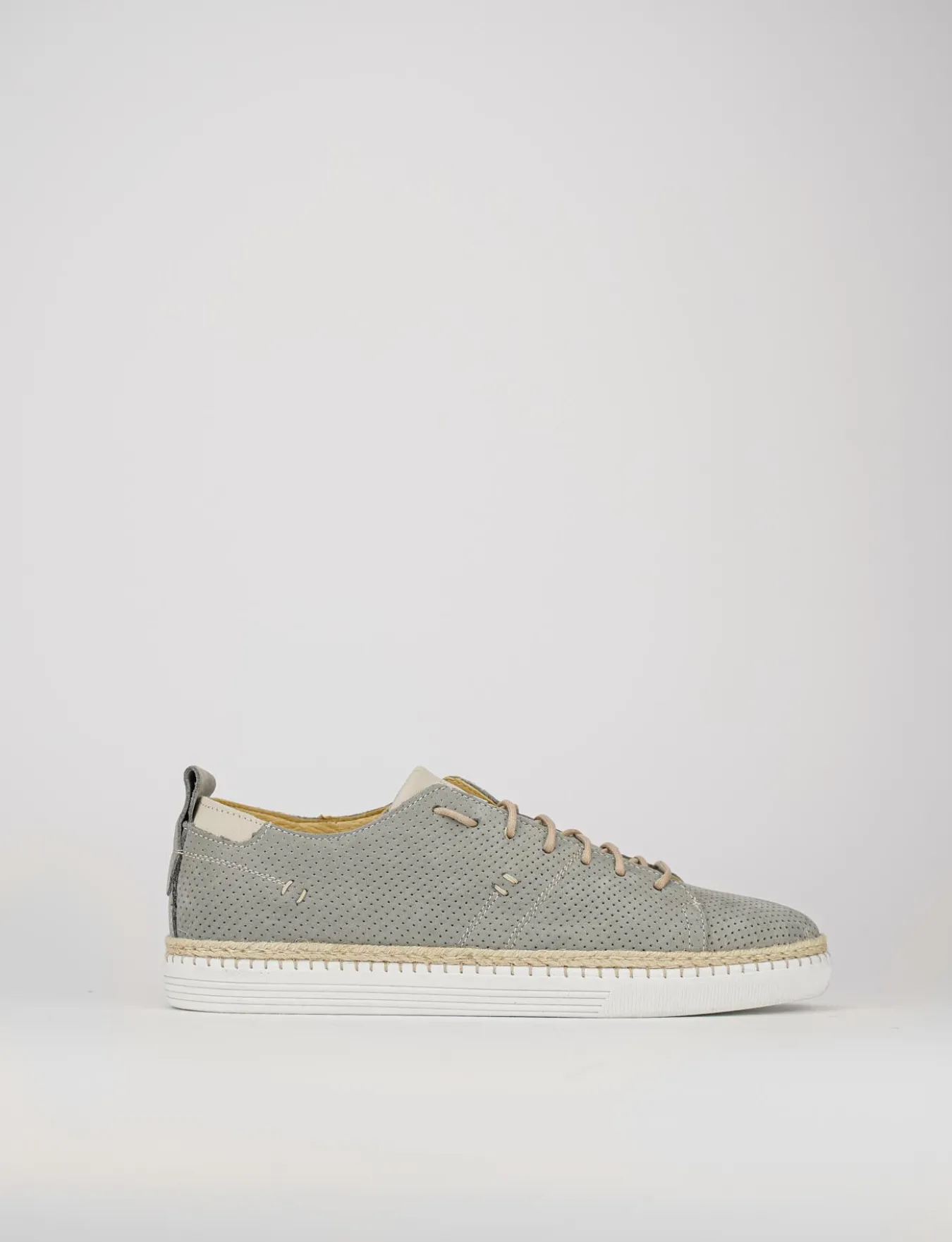 sneakers fondo in gomma e soletto interno in vera pelle. Tomaia in morbidissima pelle in nabuk interamente microforata con allacciatura lunga sul collo del piede.