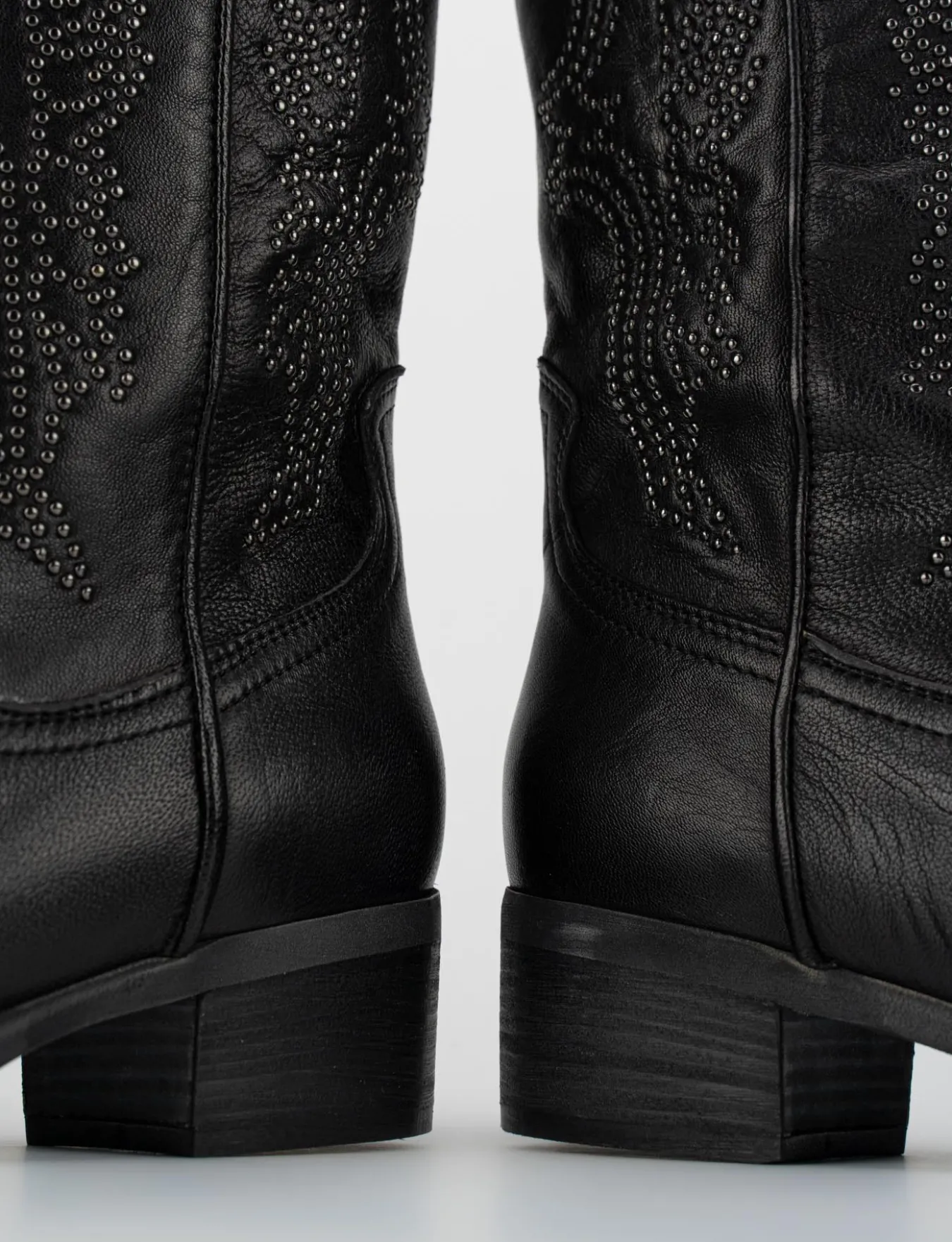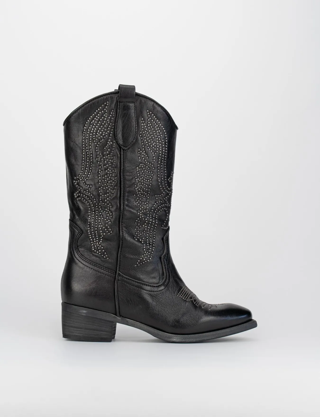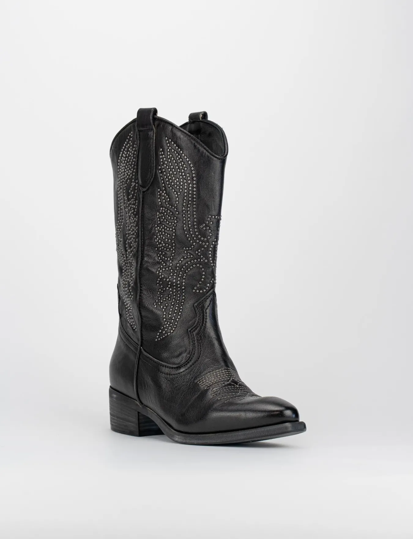 Stivale texano tacco 3cm, fondo gomma e soletto interno in vera pelle. Tomaia in morbida nappa con cuciture tex a contrasto e particolare ricamo sul gambale tempestato di miniborchiette. Texas-mania.