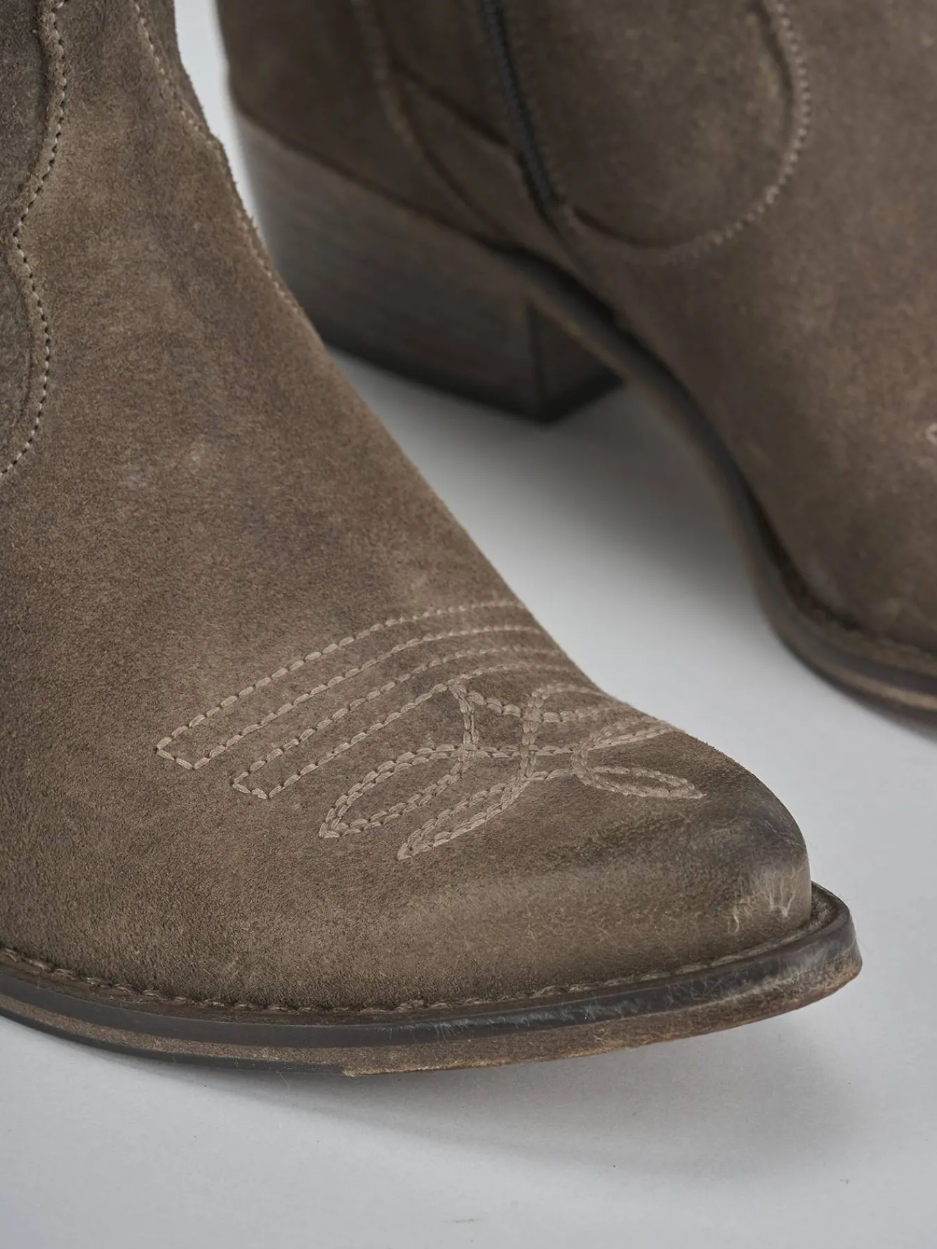 Stivaletto texano tacco 3 cm fondo in cuoio e soletto interno in vera pelle. Tomaia in morbido camoscio, punta sfilata, ricami, ghette, rapida chiusura con cerniera laterale e tacco cubano. Perfetto per qualsiasi occasione.