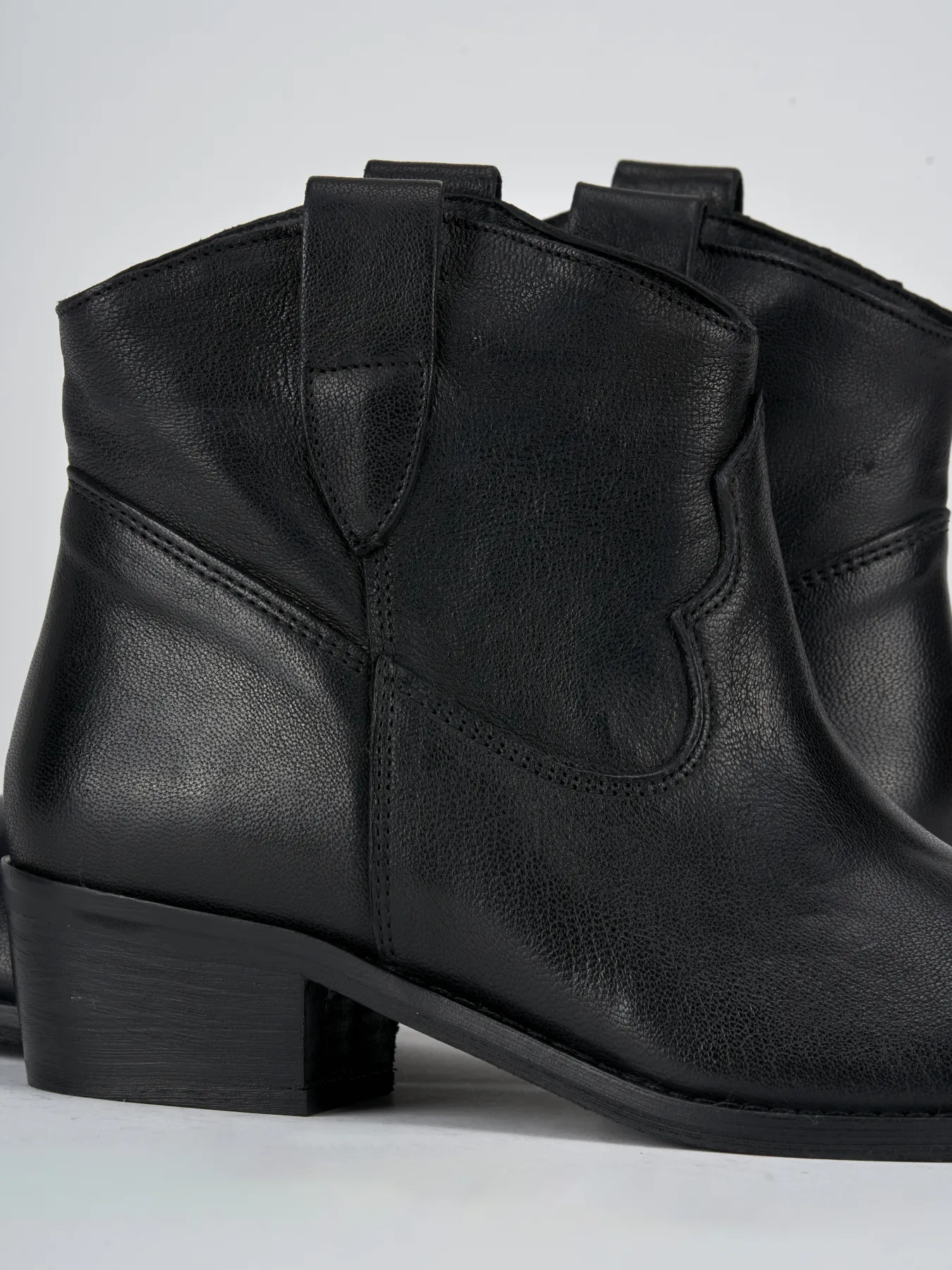 Stivaletto texano tacco 3 cm fondo in leggera gomma e soletto interno in vera pelle. Tomaia in morbida pelle, punta tonda, cuciture a vista, ghette e guardolo sporgente per chi ama i dettagli. Perfetto con jeans e una camicia floreale.