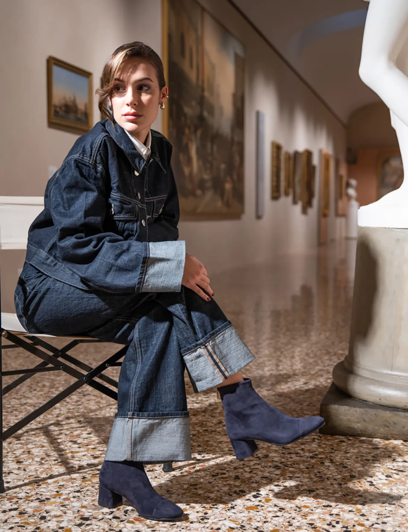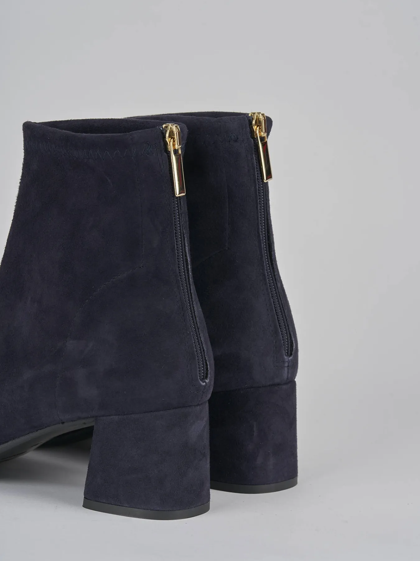 Stivaletto tacco 5.5 cm fondo in gomma e soletto interno in vera pelle. tomaia in morbido camoscio ed elasticizzato solo in caviglia, puntale ton sur ton, comoda cerniera posteriore e tacco grosso per un look che non passa mai di moda.