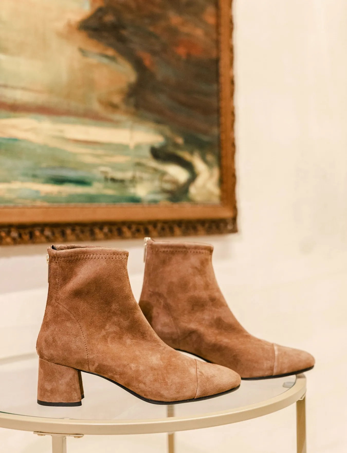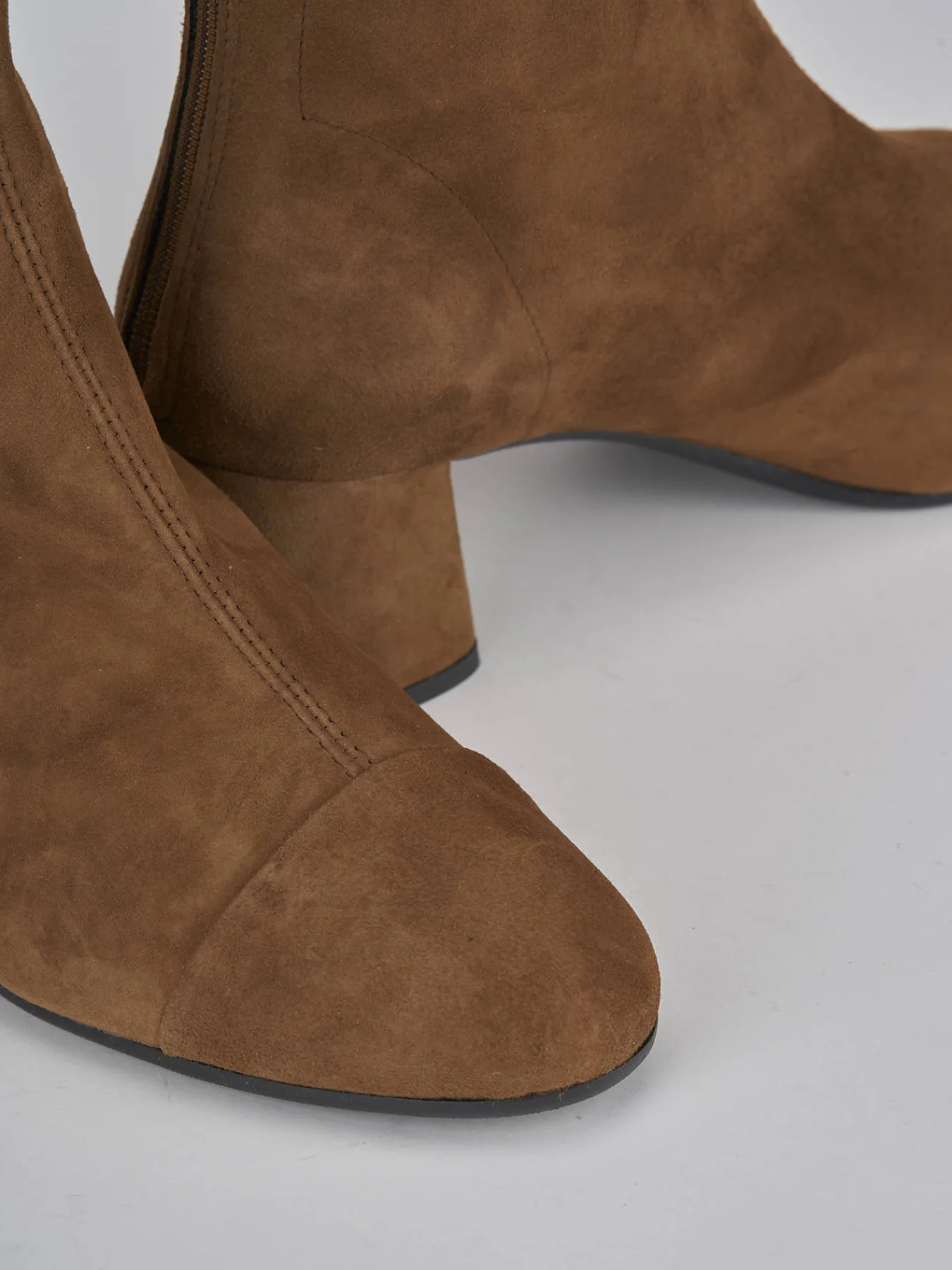 Stivaletto tacco 5.5 cm fondo in gomma e soletto interno in vera pelle. tomaia in morbido camoscio ed elasticizzato solo in caviglia, puntale ton sur ton, comoda cerniera posteriore e tacco grosso per un look che non passa mai di moda.