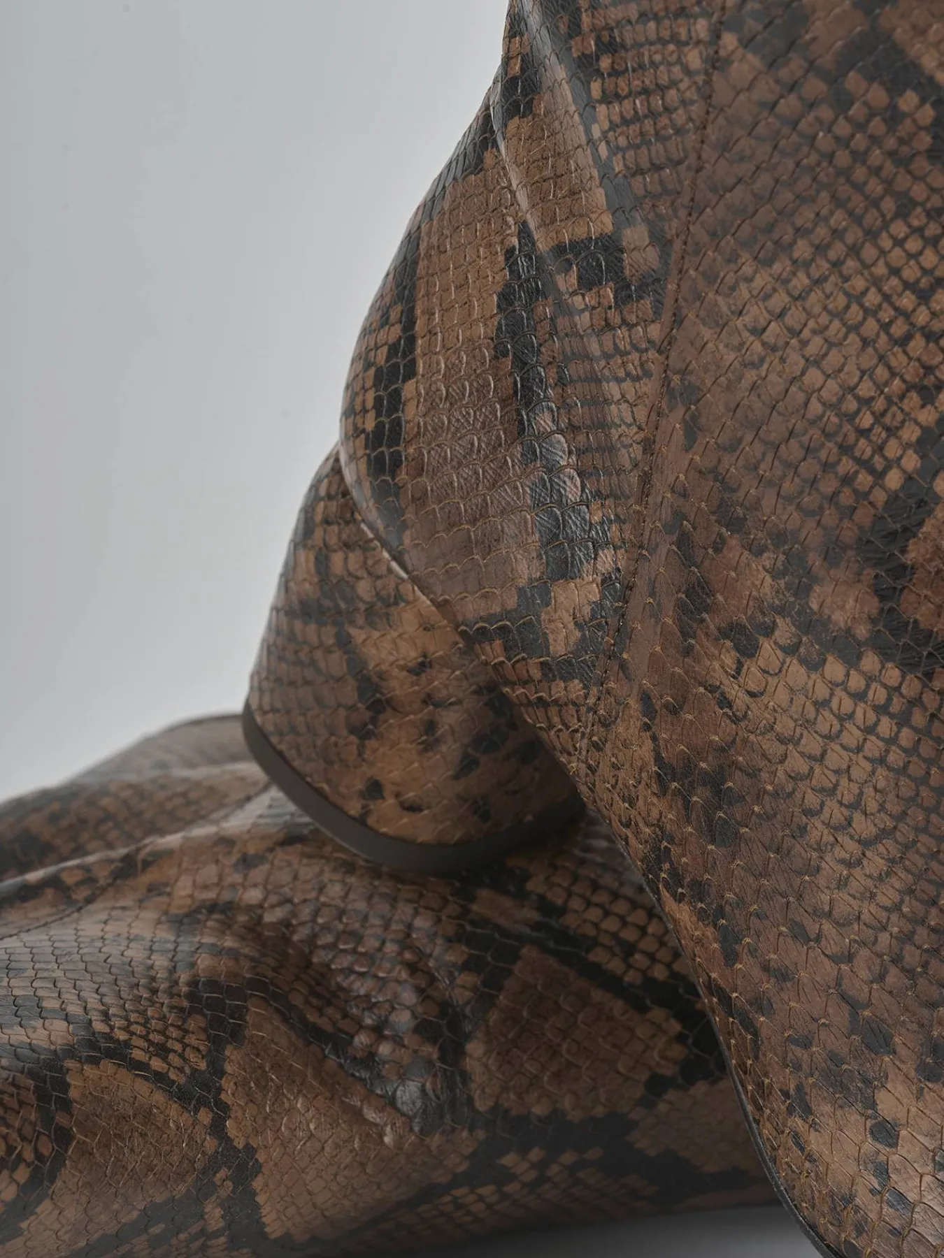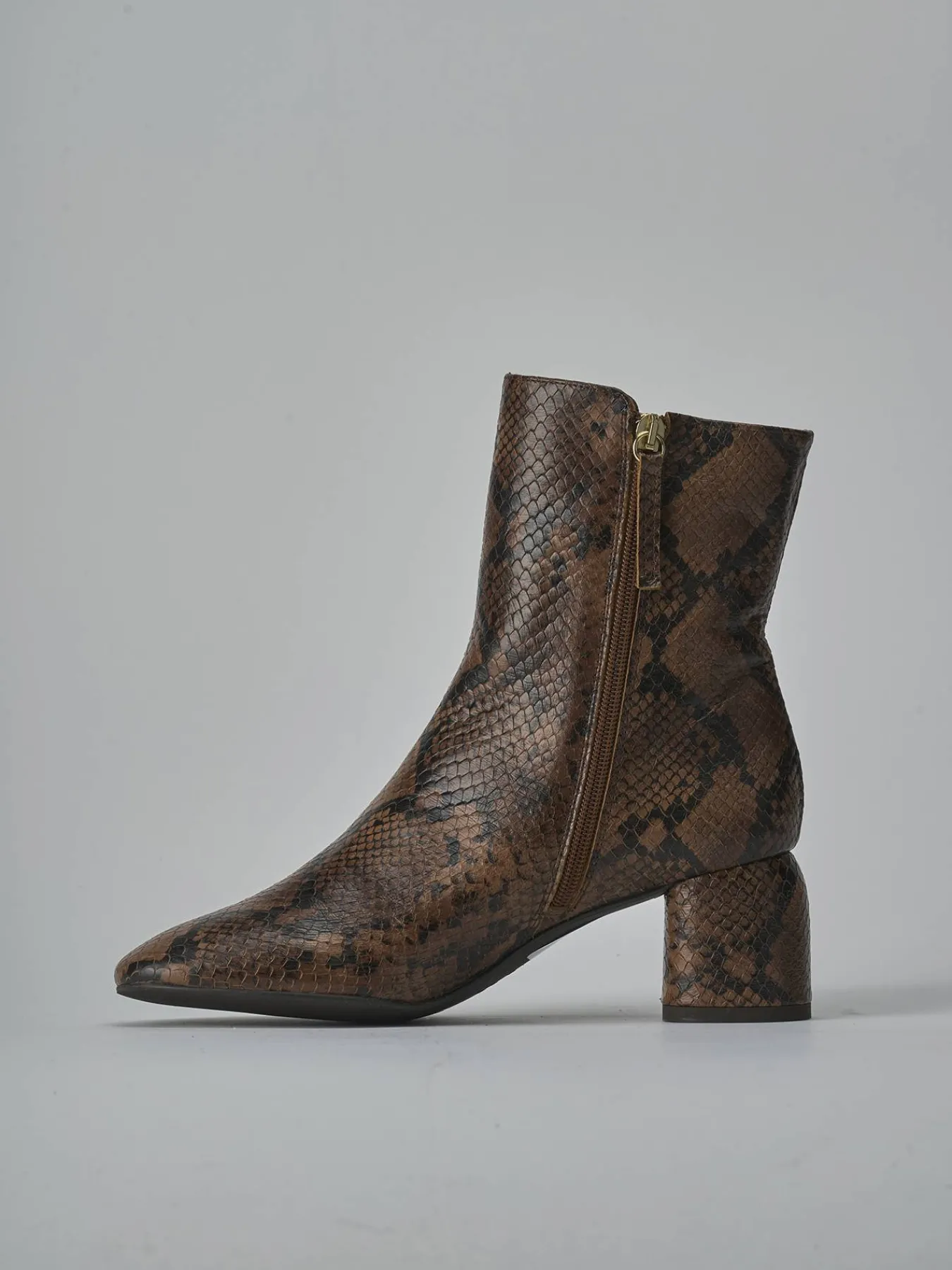 Con un tacco di 6 cm, questi stivaletti in effetto pitonato marrone esaltano la femminilità e lo stile chic di ogni donna.