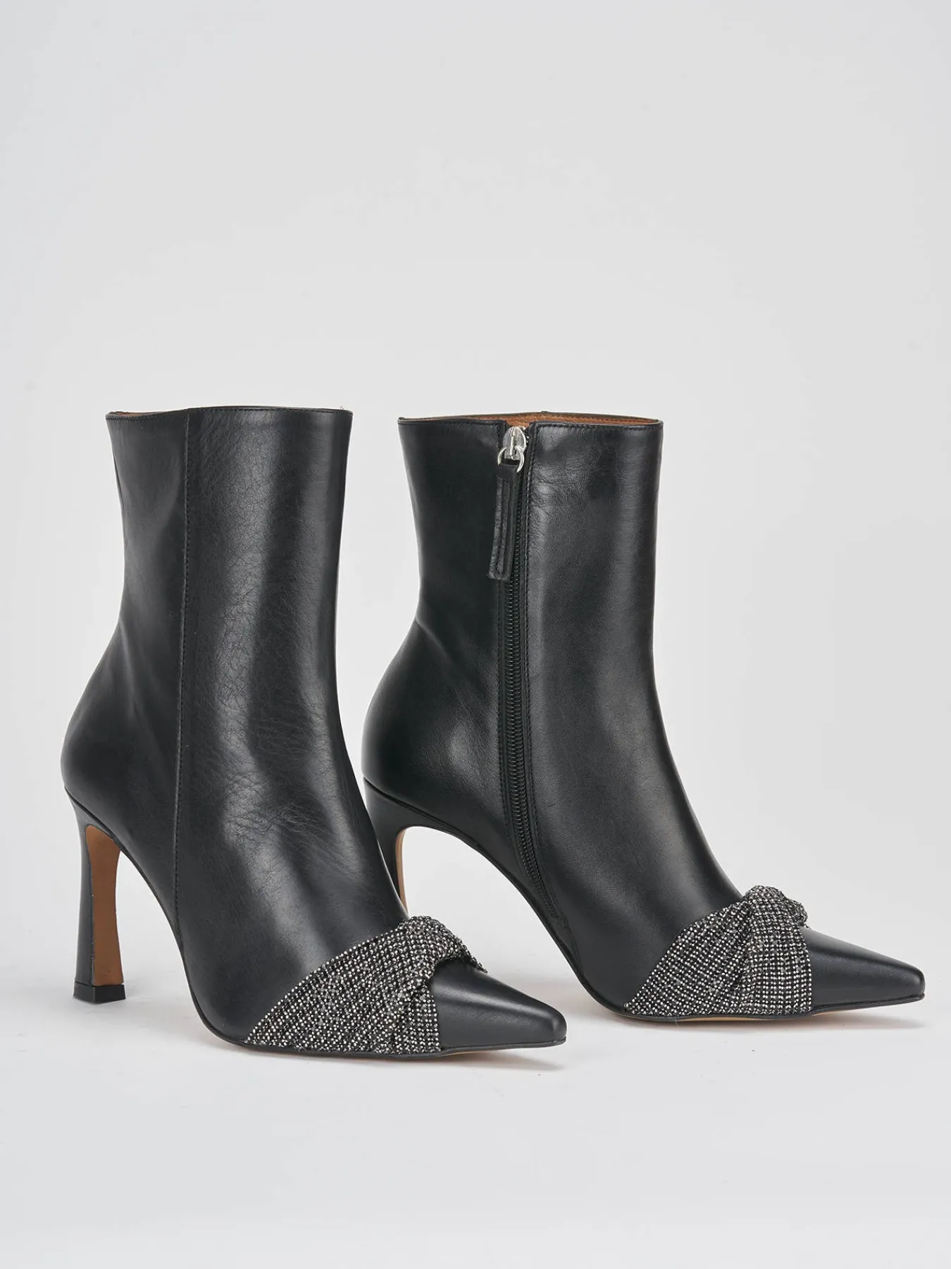 tronchetto tacco 9 cm fondo in gomma e soletto interno in vera pelle. tomaia in morbida pelle nappata, punta sfilata, accessorio con strass, cerniera laterale e tacco rocchetto. versatile con una gonna o un vestito per un tocco luminoso ai tuoi look.