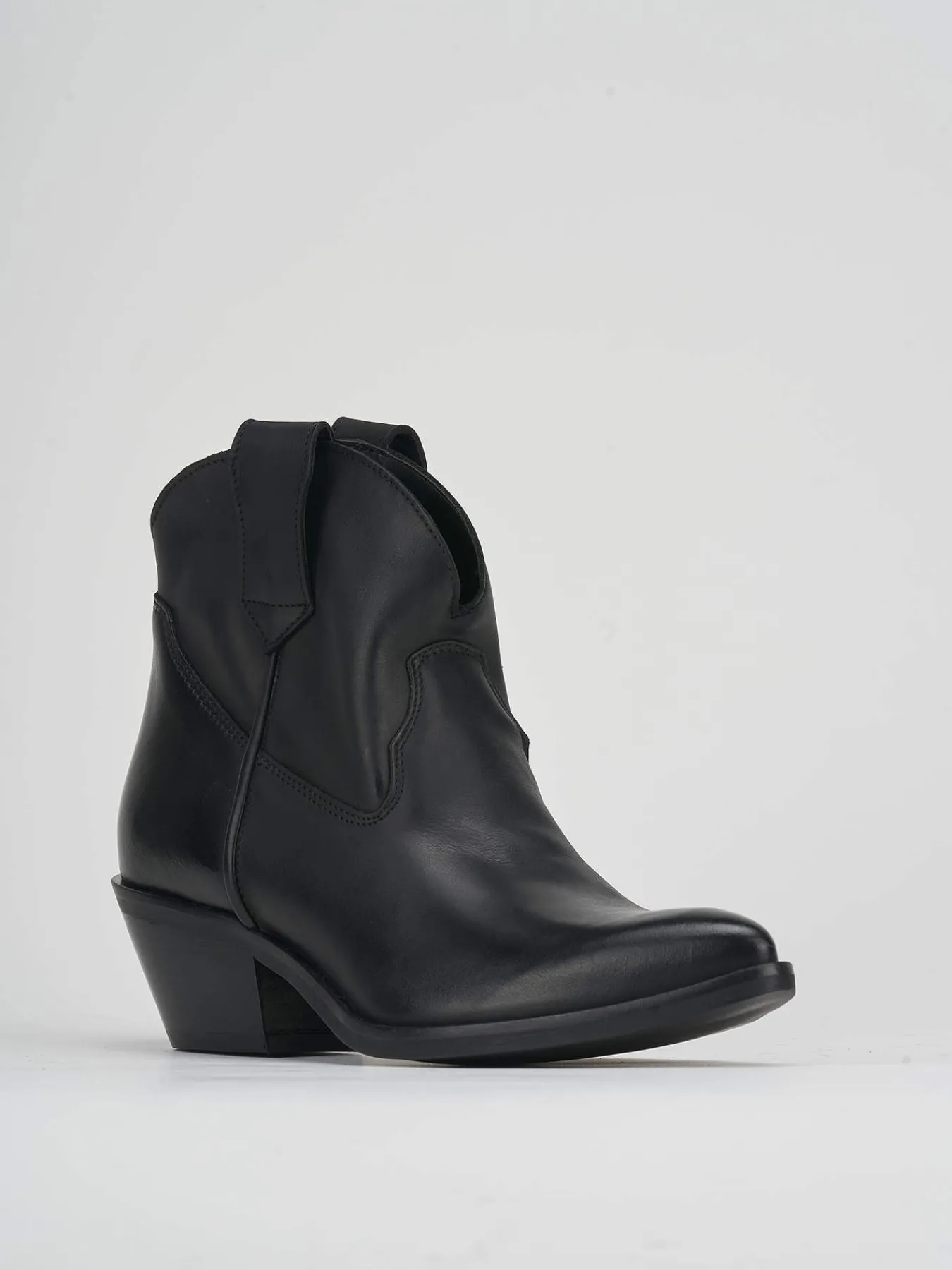 Stivaletto texano tacco 5 cm, fondo in cuoio e soletto interno in vera pelle. Tomaia in morbida pelle vitello, punta sfilata, cuciture visibili, adatto con dei jeans o un vestito per un look cool.