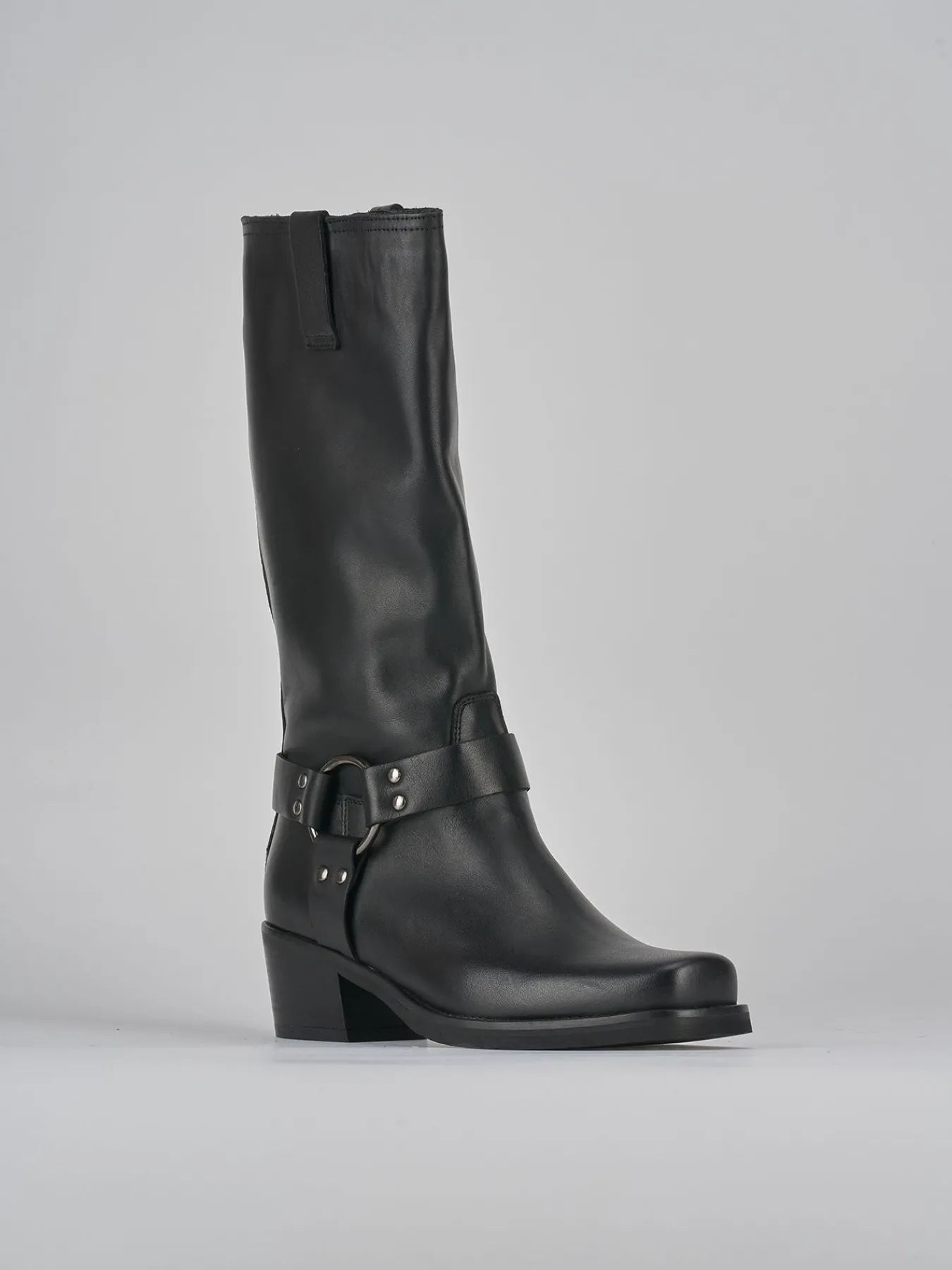 Stivale biker tacco 4 cm fondo in gomma e soletto interno in vera pelle. Tomaia in morbida pelle, punta leggermente squadrata, ghette, cerniera laterale, altezza gambale a tre quarti polpaccio, accessorio ad anello che riunisce tre fascette al livello della caviglia e tacco grosso per un look adatto ad ogni occasione.