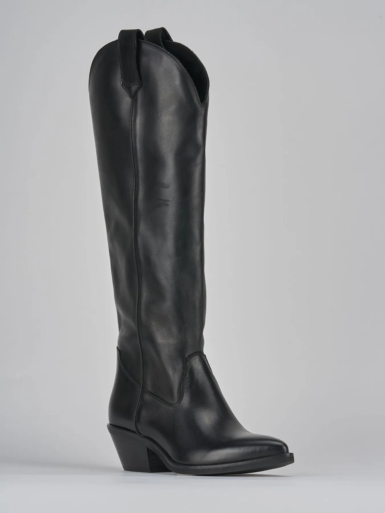 Stivale texano tacco 4 cm fondo in gomma e soletto interno in vera pelle. Tomaia in morbida pelle, punta sfilata, guardolo sporgente, cuciture visibili, altezza gambale appena sotto al ginocchio con ghette laterali in cima e tacco cubano per un look texano.