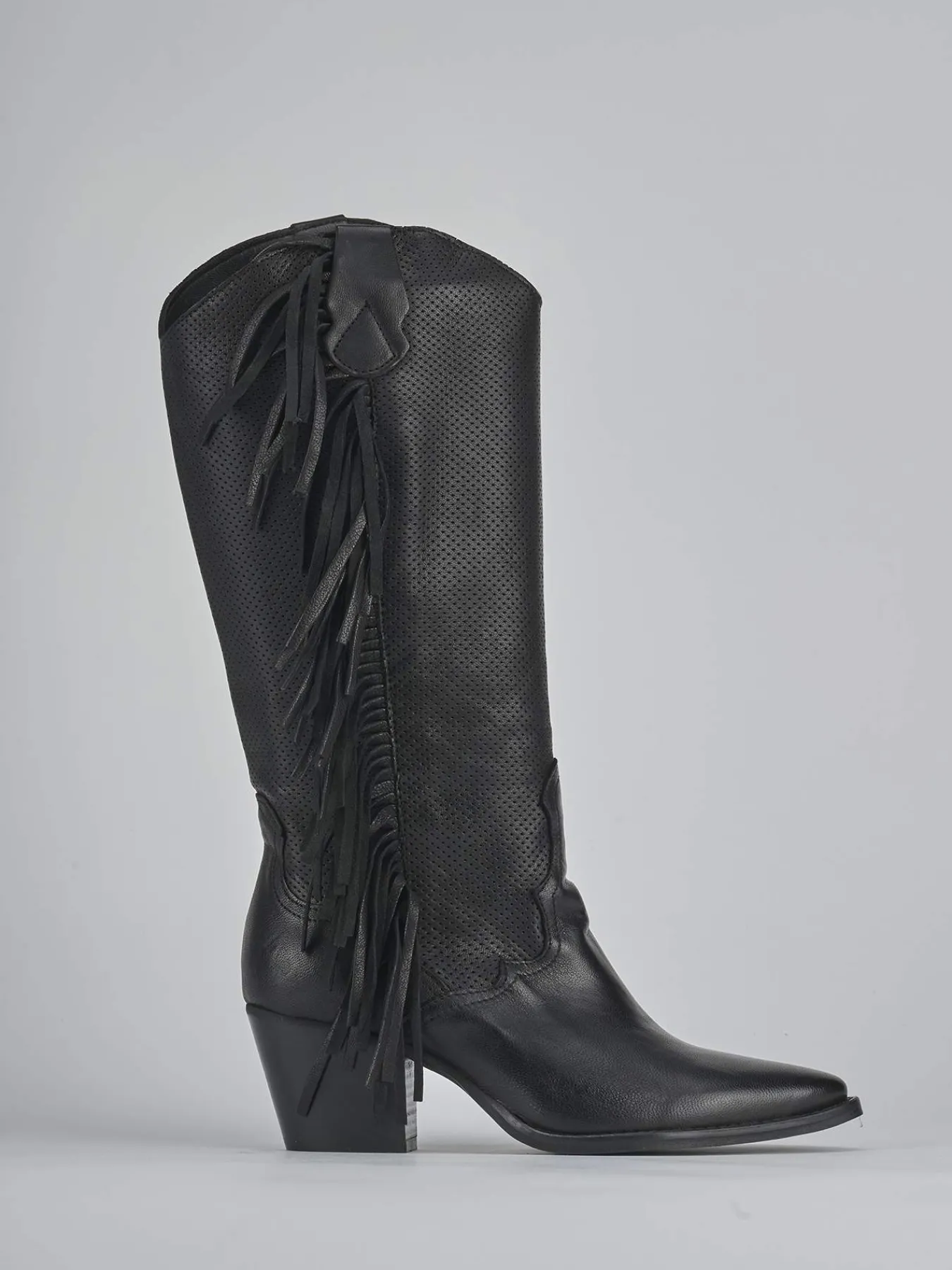 Stivale texano tacco 6 cm fondo in gomma e soletto interno in vera pelle. Tomaia in morbida pelle, punta sfilata, frange laterali, ghette che mantengono la forma del gambale che misura appena sotto il ginocchio e tacco cubano. Dal design ricercato per un look cool.