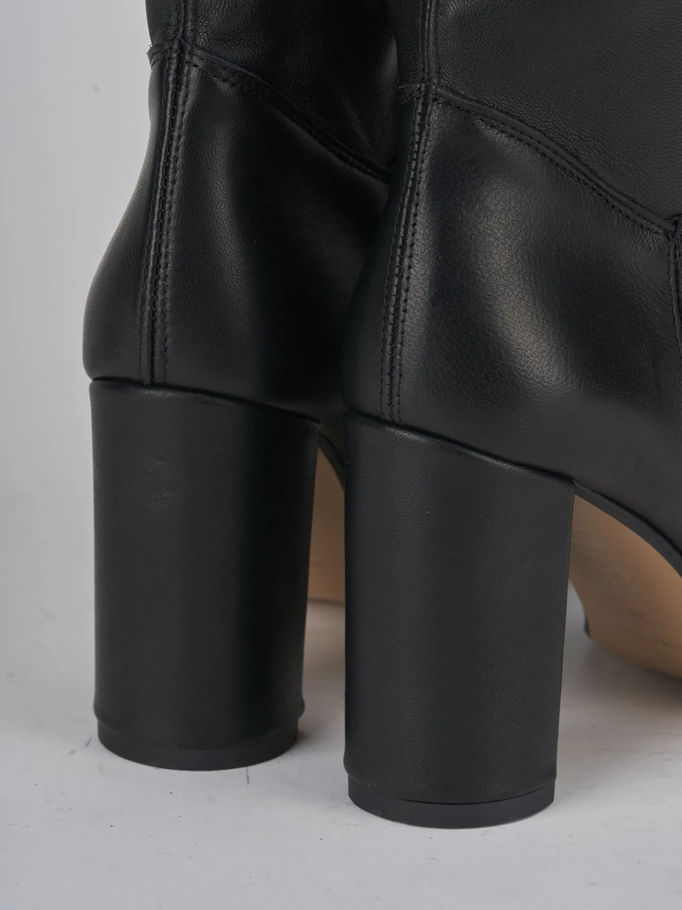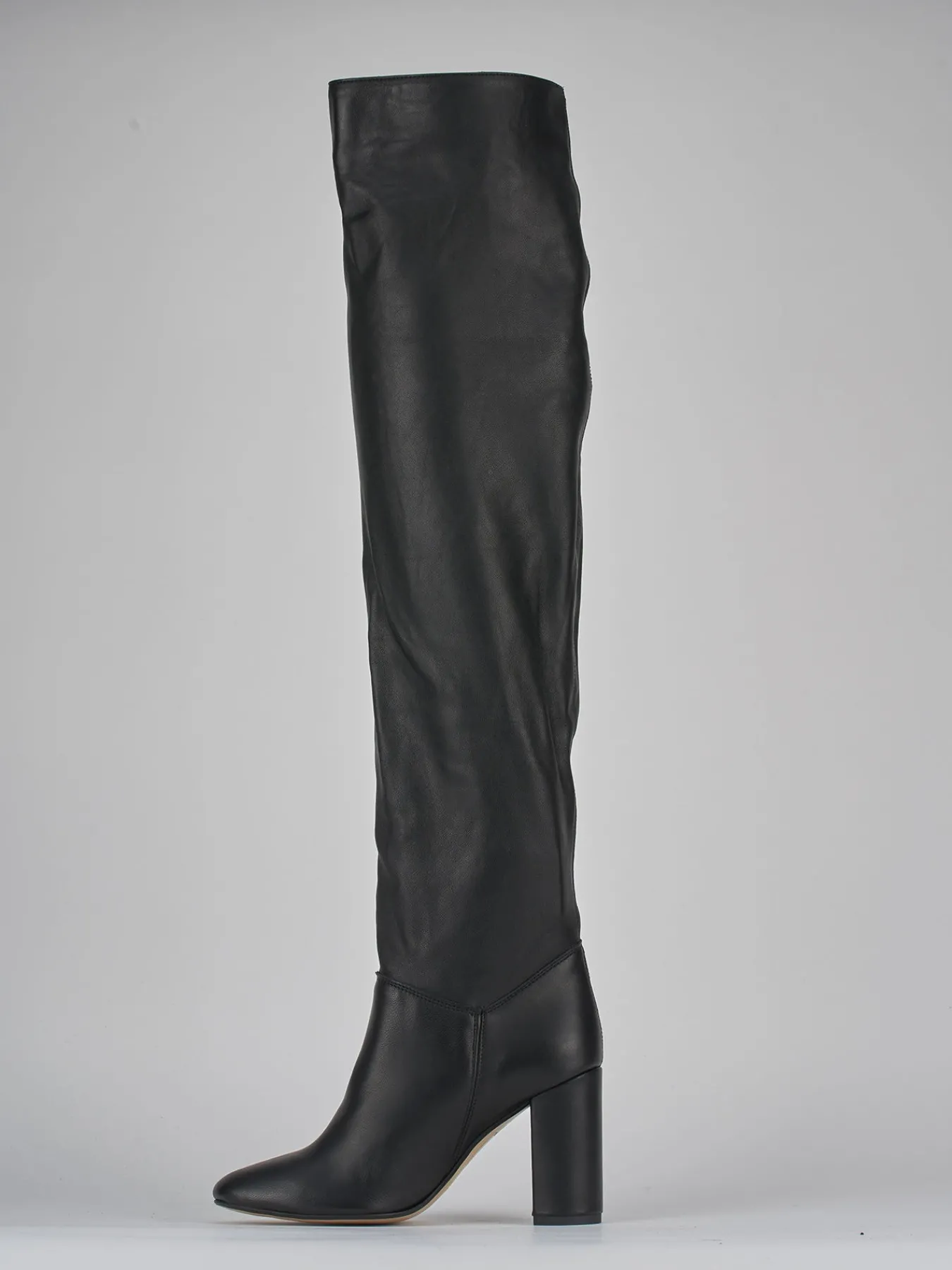 stivale tacco 8 cm fondo in leggera gomma e soletto interno in vera pelle. tomaia in morbida pelle nappata, punta tonda, cuciture a vista, gambale sfoderato tubolare che misura appena sopra ginocchio. senza guardolo e tacco grosso per un look chic.