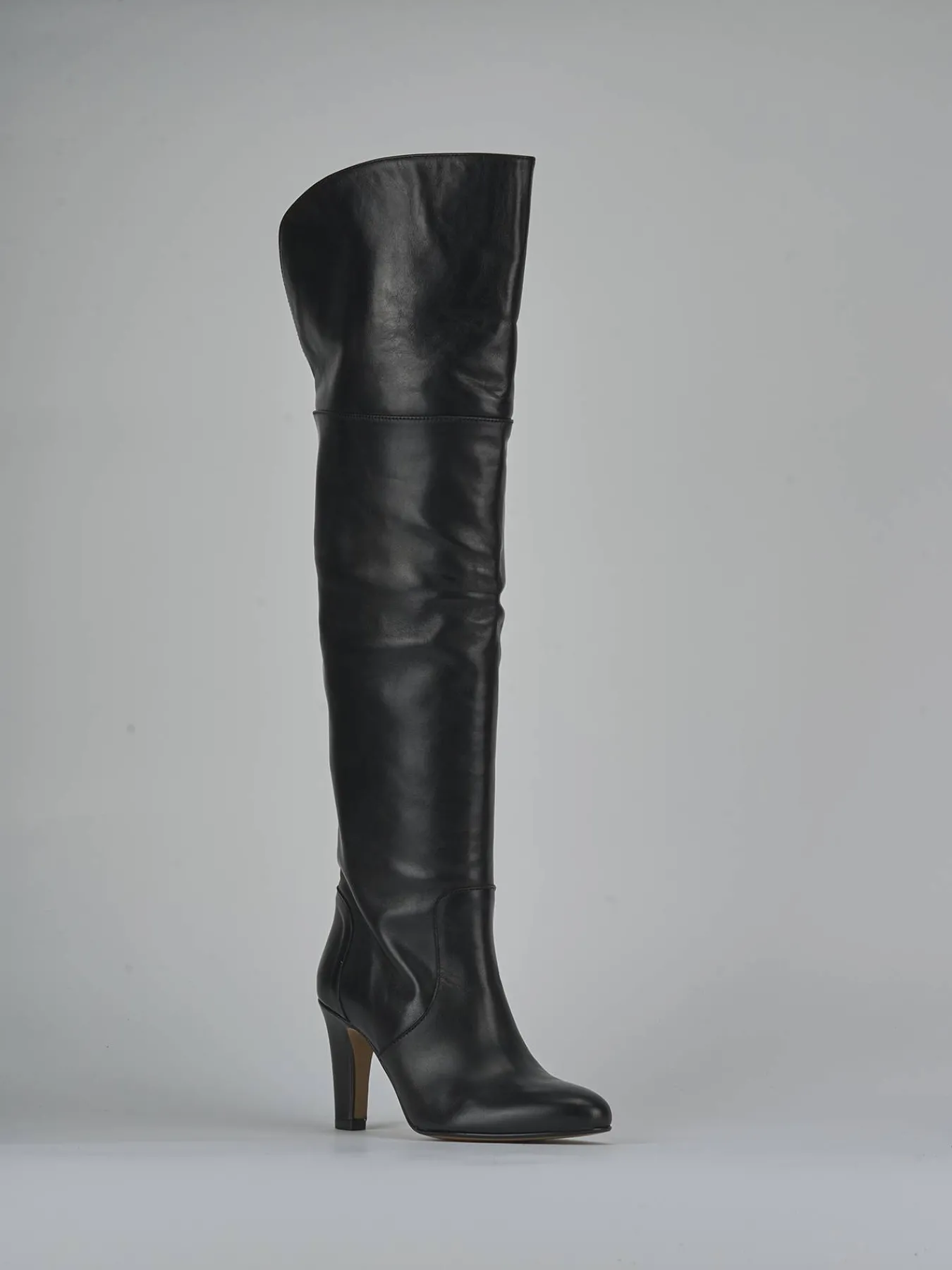 Realizzati in morbida pelle, questi stivali presentano una punta tonda e cuciture visibili lungo il gambale tubolare che si estende appena sopra il ginocchio.