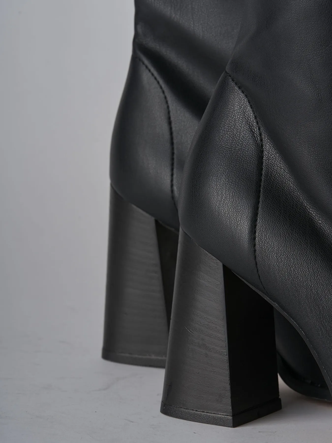 stivale tacco 9 cm fondo in leggera gomma e soletto interno in vera pelle. tomaia in morbida pelle stretch, punta squadrata, cuciture a vista a metà stivale, gambale aderente a tutte le gambe per un fit perfetto e che misura appena sopra il ginocchio. tacco grosso in cuoio e guardolo sporgente.
