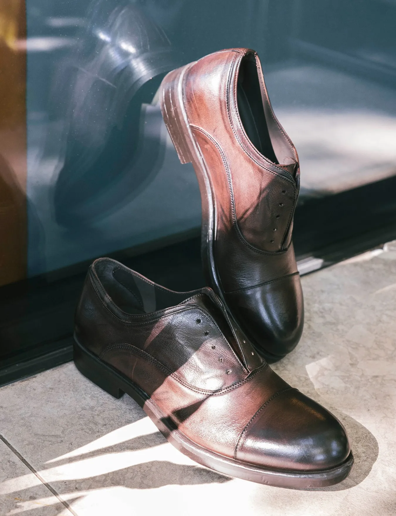 Il modello derby, senza lacci, si distingue per le cuciture a vista che ne esaltano il carattere artigianale.